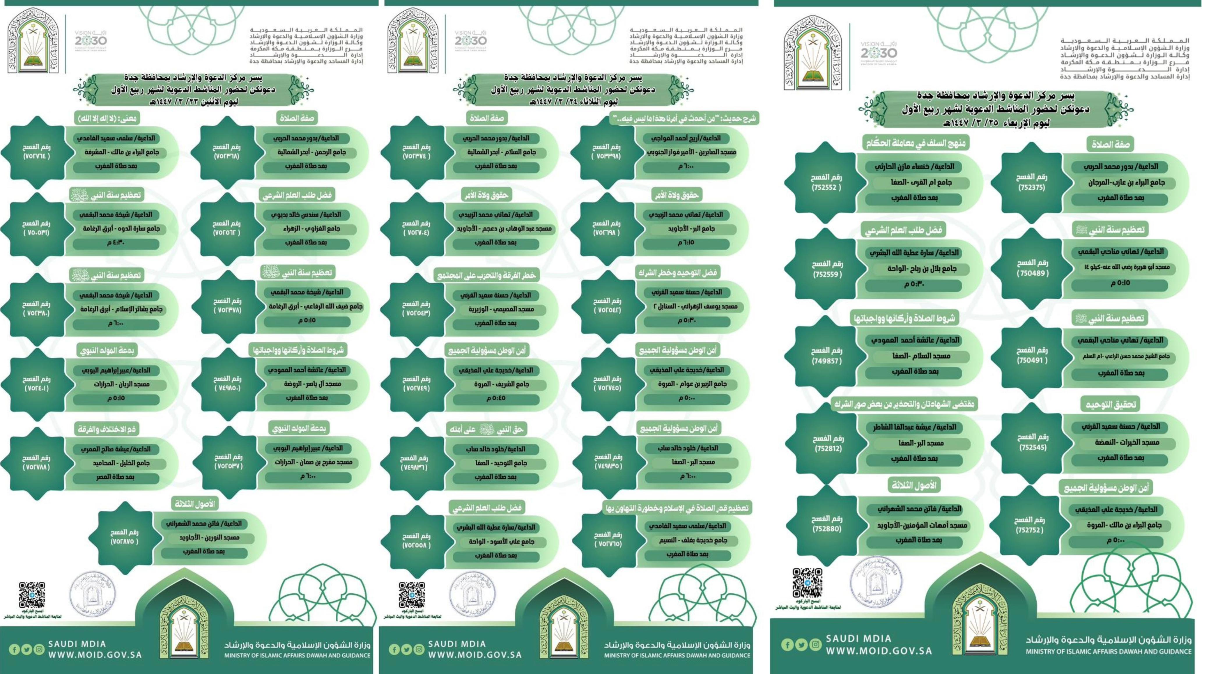 الشؤون الإسلامية بمكة المكرمة تنظم مناشط دعوية بمحافظة جدةينظم فرع وزارة الشؤون الإسلامية والدعوة والإرشاد بمنطقة مكة المكرمة، ممثلاً بإدارة الدعوة والإرشاد، وبالتعاون مع إدارة المساجد والدعوة والإرشاد بمحافظة جدة، سلسلة من المناشط الدعوية في عدد من الجوامع 22/ربيع الأول/1447 التفاصيل