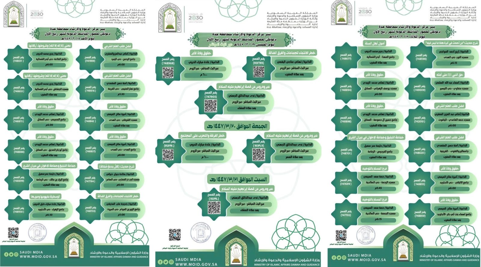 الشؤون الإسلامية بمكة المكرمة تنفذ عدداً من الكلمات والمحاضرات بمحافظة جدةينفذ فرع وزارة الشؤون الإسلامية والدعوة والإرشاد بمنطقة مكة المكرمة، ممثلاً بإدارة المساجد والدعوة والإرشاد بمحافظة جدة، سلسلة من الكلمات والمحاضرات الدعوية في جوامع ومساجد المحافظة، وذلك خلال الفترة 15/ربيع الأول/1447 التفاصيل