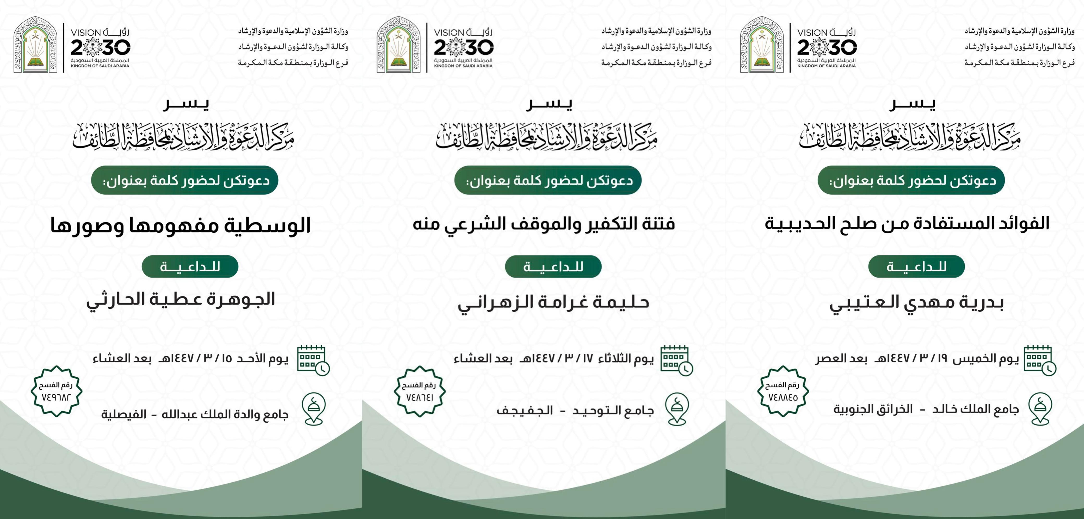 الشؤون الإسلامية بمكة المكرمة تنفذ سلسلة من المناشط الدعوية بمحافظة الطائفينفذ فرع وزارة الشؤون الإسلامية والدعوة والإرشاد بمنطقة مكة المكرمة، بالتعاون مع إدارة المساجد والدعوة والإرشاد بمحافظة الطائف، سلسلة من المناشط الدعوية في عدد من الجوامع والمساجد، خلال الفترة من 15 إلى 16/ربيع الأول/1447 التفاصيل
