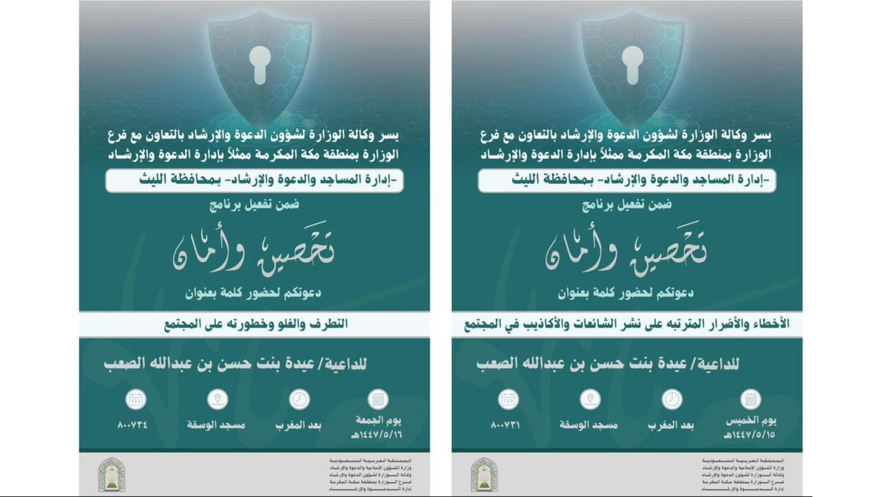 فرع وزارة الشؤون الإسلامية بمنطقة مكة المكرمة يواصل تنفيذ برنامج “تحصين وأمان”يواصل فرع وزارة الشؤون الإسلامية والدعوة والإرشاد بمنطقة مكة المكرمة تنفيذ برنامج “تحصين وأمان” ، والذي يأتي في إطار جهود الوزارة لتعزيز الوعي الفكري وترسيخ قيم الوسطية والاعتدال بين أفراد المجتمع. ويُقام 19/جمادى الأولى/1447 التفاصيل