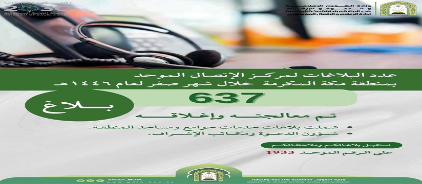 إغلاق (637) بلاغاً عبر الاتصال الموحد بمكة المكرمةأغلق فرع الوزارة في منطقة مكة المكرمة، خلال شهر صفر الجاري، (637) بلاغاً عبر مركز خدمة الاتصال الموحد "1933"، شملت بلاغات خدمات جوامع ومساجد المنطقة، وشؤون الدعوة، ومكاتب الإشراف، وقام المركز 30/صفر/1446 التفاصيل