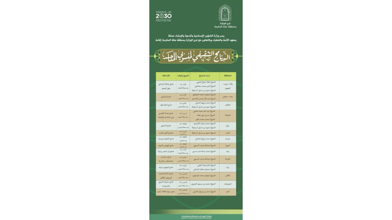 "الشؤون الإسلامية بمكة المكرمة" تُنفذ البرنامج التثقيفي لمنسوبي المساجد بمنطقة مكة المكرمةيُنفذ فرع وزارة الشؤون الإسلامية والدعوة والإرشاد بمنطقة مكة المكرمة بالتعاون مع معهد الأئمة والخطباء برنامجاً تثقيفياً لمنسوبي مساجد المنطقة خلال الفترة الممتدة من السبت الموافق 1447/5/3 إلى الخميس 1447/5/8هـ 05/جمادى الأولى/1447 التفاصيل