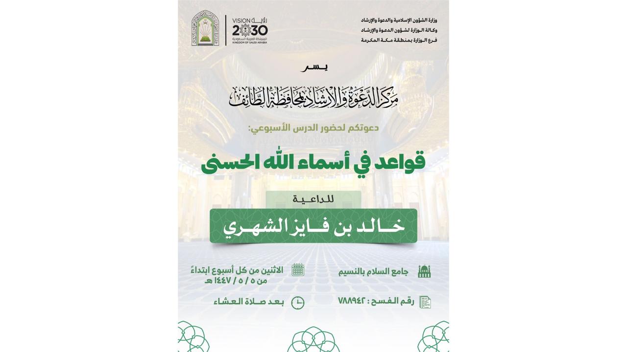 الشؤون الإسلامية بمكة تنفّذ درسًا أسبوعيًا بعنوان «قواعد في أسماء الله الحسنى» بمحافظة الطائفينفّذ فرع وزارة الشؤون الإسلامية والدعوة والإرشاد بمنطقة مكة المكرمة، ممثلاً في مركز الدعوة والإرشاد بمحافظة الطائف، درسًا أسبوعيًا بعنوان «قواعد في أسماء الله الحسنى»، يُقدَّم كل يوم اثنين بعد صلاة العشاء 05/جمادى الأولى/1447 التفاصيل