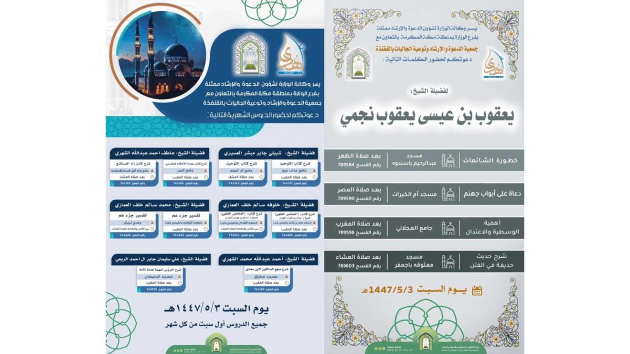 فرع الشؤون الإسلامية بمكة المكرمة ينفّذ مناشط دعوية بالعاصمة المقدسة ضمن برنامج التقويم الدعوينفّذ فرع وزارة الشؤون الإسلامية والدعوة والإرشاد بمنطقة مكة المكرمة، خلال الفترة من 4 إلى 10 جمادى الأولى 1447هـ، عددًا من المناشط الدعوية في عددٍ من الجوامع والمساجد بالعاصمة المقدسة، وعن بُعد 11/جمادى الأولى/1447 التفاصيل