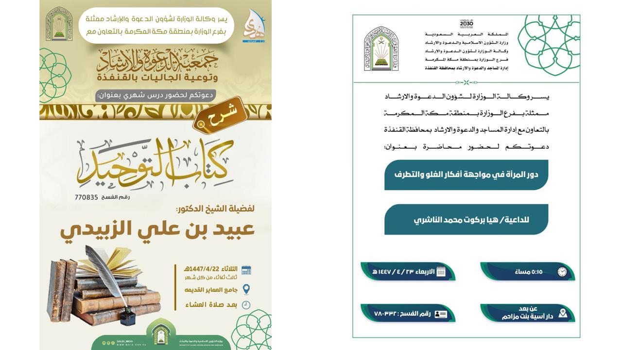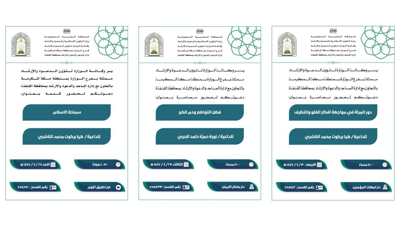 الشؤون الإسلامية بمكة تنظم سلسلة من الكلمات الدعوية النسائيه بمحافظة القنفذةينظم فرع وزارة الشؤون الإسلامية والدعوة والإرشاد بمنطقة مكة المكرمة، ممثلاً بإدارة المساجد والدعوة والإرشاد بمحافظة القنفذة، خلال الأسبوع الجاري ابتداءً من يوم الأحد الموافق 27 ربيع الثاني 1447هـ، سلسلة 28/ربيع الثاني/1447 التفاصيل