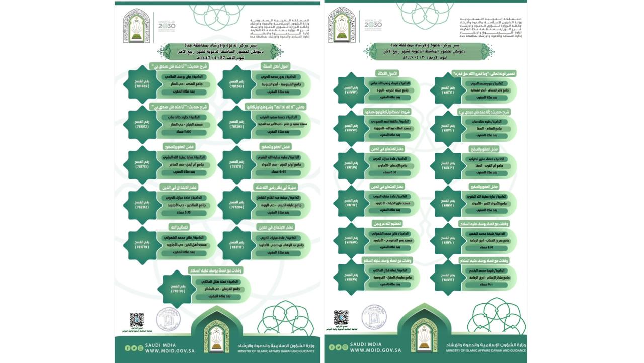 الشؤون الإسلامية تنظم سلسلة من المحاضرات العلمية في مساجد وجوامع مكة المكرمةينفذ فرع وزارة الشؤون الإسلامية والدعوة والإرشاد بمنطقة مكة المكرمة سلسلة من المحاضرات العلمية والكلمات الدعوية في عددٍ من الجوامع والمساجد بالعاصمة المقدسة، خلال الفترة من 28 إلى 30 من شهر ربيع الآخر 29/ربيع الثاني/1447 التفاصيل