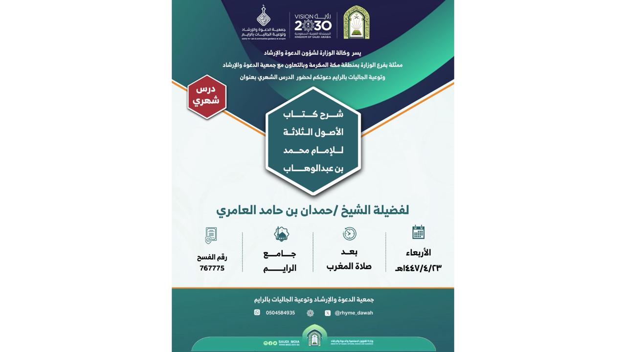 الشؤون الاسلامية تنظم سلسلة من الدروس العلمية لشرح كتاب الأصول الثلاثة بمحافظة رنيةينظم فرع وزارة الشؤون الإسلامية والدعوة والإرشاد بمنطقة مكة المكرمة، ممثلًا بإدارة المساجد والدعوة والإرشاد بمحافظة رنية، خلال الفترة من 27 ربيع الآخر وحتى 1 جمادى الأولى 1447هـ، سلسلة دروس علمية بعنوان 27/ربيع الثاني/1447 التفاصيل