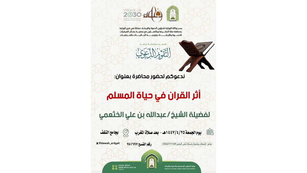 الشؤون الاسلاميه بمكة تنفذ محاضره دعويه بعنوان "اثر القرآن في حياة المسلم " بمحافظة العرضيات .نفذ فرع وزارة الشؤون الإسلامية والدعوة والإرشاد بمنطقة مكة المكرمة، ممثلاً بإدارة المساجد والدعوة والإرشاد بمحافظة العرضيات ، يوم الجمعة الموافق 25 ربيع الآخر 1447 هـ ، محاضرة دعويه بعنوان " اثر 27/ربيع الثاني/1447 التفاصيل