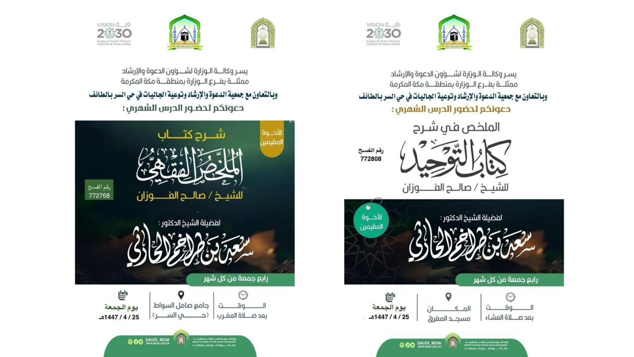 الشؤون الإسلامية تنظم دروسًا علمية شهرية بمحافظة الطائفينفذ فرع وزارة الشؤون الإسلامية والدعوة والإرشاد بمنطقة مكة المكرمة، ممثلاً بإدارة الدعوة والإرشاد، بالتعاون مع جمعية الدعوة والإرشاد وتوعية الجاليات في حي السر بمحافظة الطائف، سلسلة من الدروس العلمية 27/ربيع الثاني/1447 التفاصيل