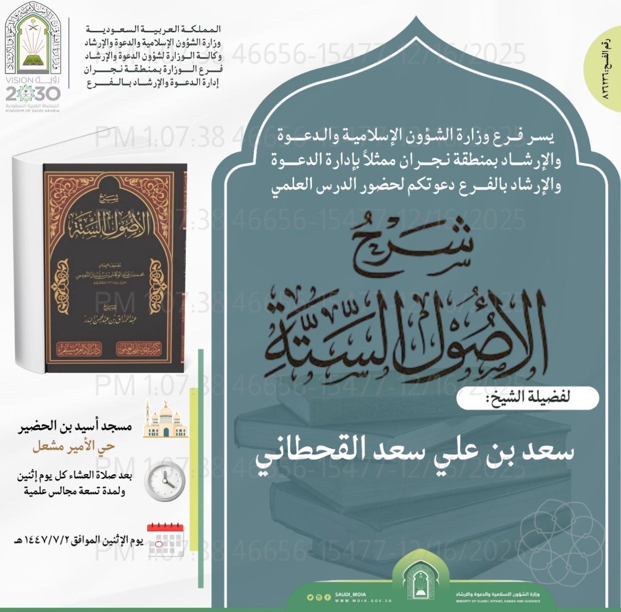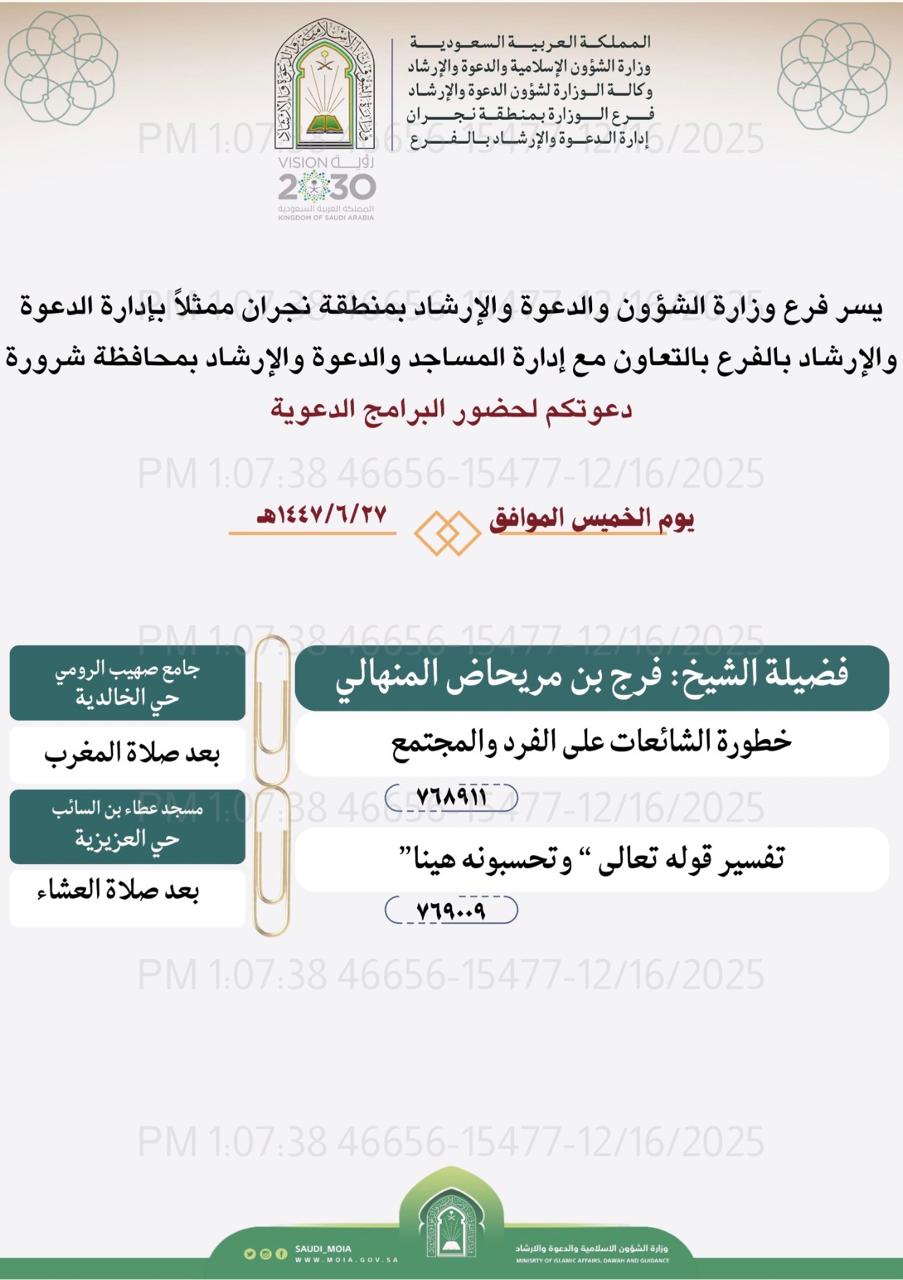 سلسلة من الدروس العلمية تطلقها الشؤون الإسلامية بنجرانتُطلق وزارةُ الشؤون الإسلامية والدعوة والإرشاد، ممثَّلةً بفرعها في منطقة نجران، - إدارة الدعوة والإرشاد- اليوم الأحد الأول من شهر رجب لعام 1447هـ، سلسلةً من الدروس العلمية في عددٍ من جوامع ومساجد المنطقة، 01/رجب/1447 التفاصيل