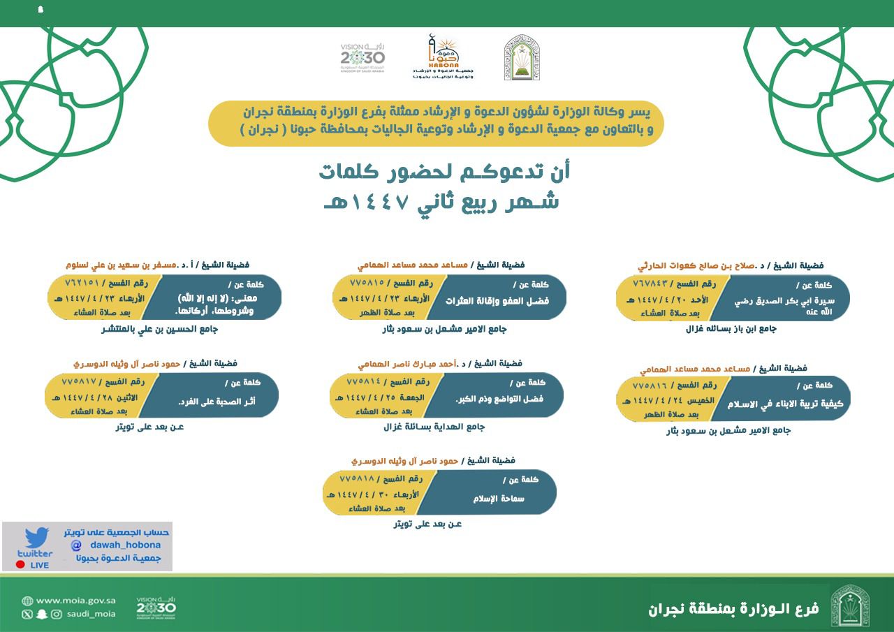 الشؤون الإسلامية بنجران تنفّذ سلسلة كلمات دعوية بمحافظة حبونا خلال شهر ربيع الآخر 1447هـينفّذ فرع وزارة الشؤون الإسلامية والدعوة والإرشاد بمنطقة نجران ممثّلًا بإدارة الدعوة والإرشاد وبالتعاون مع جمعية الدعوة والإرشاد وتوعية الجاليات بمحافظة حبونا، سلسلةً من الكلمات الدعوية في عددٍ من جوامع 20/ربيع الثاني/1447 التفاصيل