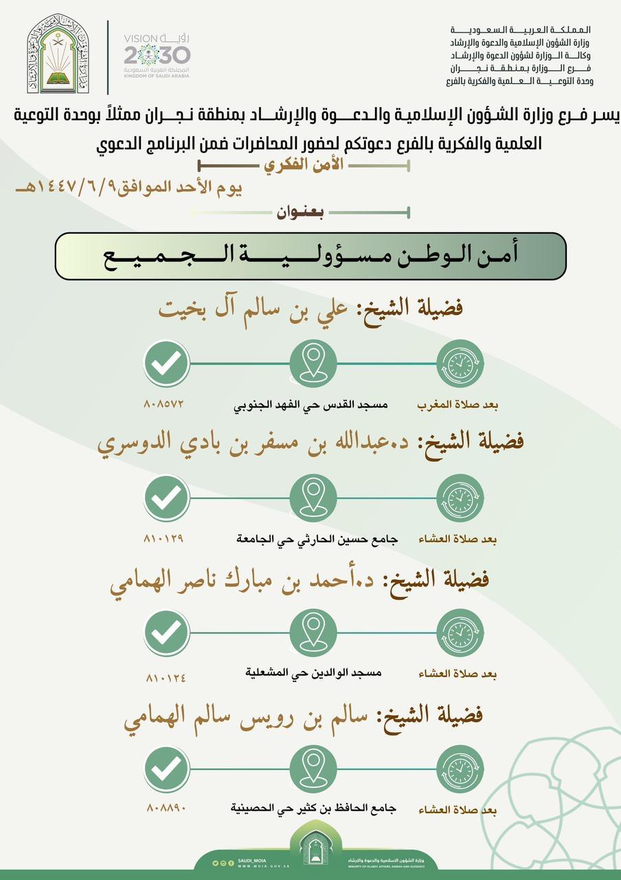 فرع الشؤون الإسلامية بنجران يُنفّذ برنامجًا توعويًا حول الأمن الفكري في جوامع ومساجد المنطقةينفذ فرعُ وزارة الشؤون الإسلامية والدعوة والإرشاد بمنطقة نجران، ممثلاً بوحدة التوعية العلمية والفكرية، يوم الأحد التاسع من شهر جمادى الآخرة للعام 1447هـ ، محاضرة ضمن برنامج "الأمن الفكري"، 09/جمادى الثانية/1447 التفاصيل