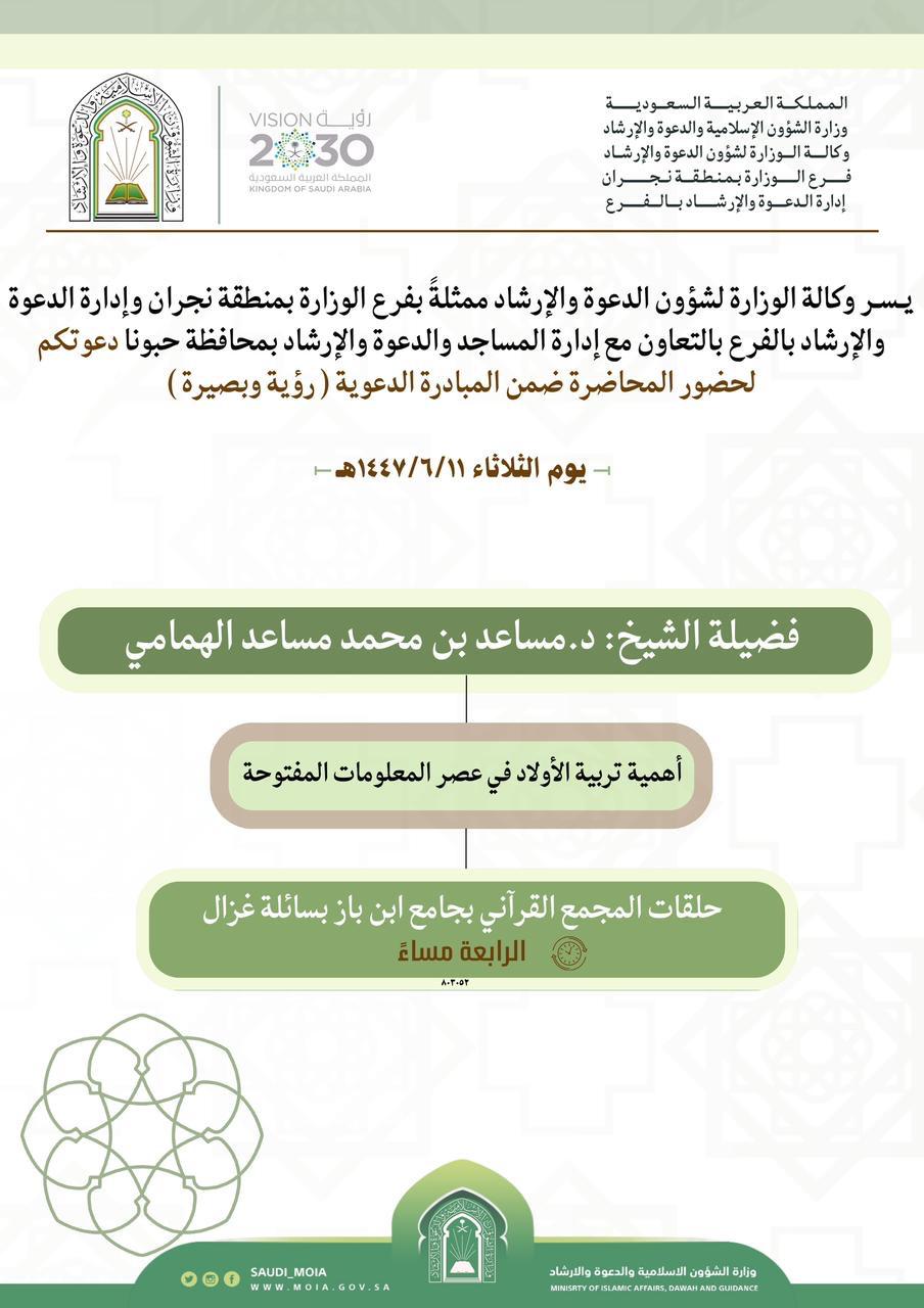 الشؤون الإسلامية بنجران تنفّذ مبادرة "رؤية وبصيرة"لتعزيز الوعي الأسري والفكري في المنطقة وشرورةتُنفّذ وزارة الشؤون الإسلامية والدعوة والإرشاد، ممثلةً بفرعها في منطقة نجران، بإدارة الدعوة والإرشاد ، اليوم الإثنين العاشر من شهر جمادى الآخرة لعام 1447هـ، سلسلة من المحاضرات الدعوية ضمن مبادرة "رؤية 10/جمادى الثانية/1447 التفاصيل