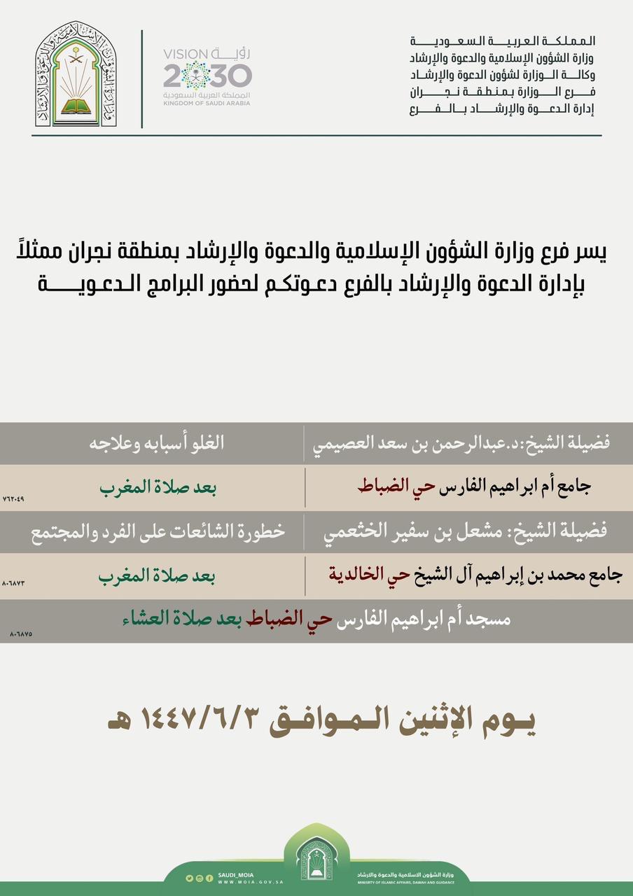 الشؤون الإسلامية بنجران تواصل جهودها الدعوية بسلسلة محاضرات توعوية في المنطقة وشرورةتواصل وزارةُ الشؤون الإسلامية والدعوة والإرشاد، ممثلةً بفرعها في منطقة نجران، بإدارة الدعوة والإرشاد ، تنفيذ سلسلة من المحاضرات التوعوية اليوم الإثنين العاشر من جمادى الآخرة لعام 1447هـ، وذلك في عددٍ 10/جمادى الثانية/1447 التفاصيل