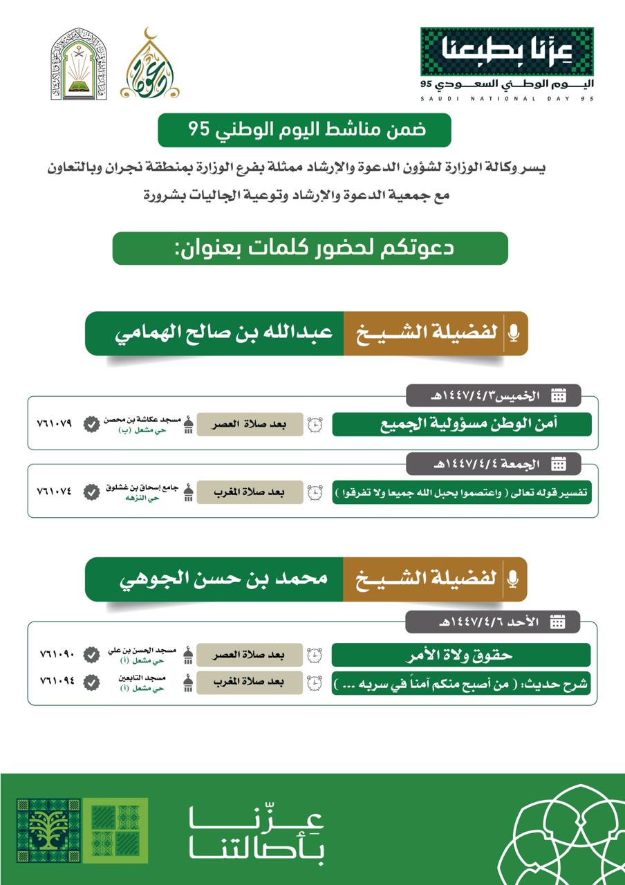 يطلق فرع وزارة الشؤون الإسلامية والدعوة والإرشاد بمنطقة نجران، اليوم الأربعاء الثاني وحتى الثالث من شهر ربيع الآخر 1447هـ، برنامجاً دعوياً يشمل محاضرات وكلمات دعوية، تزامناً مع اليوم الوطني الخامس والتسعين