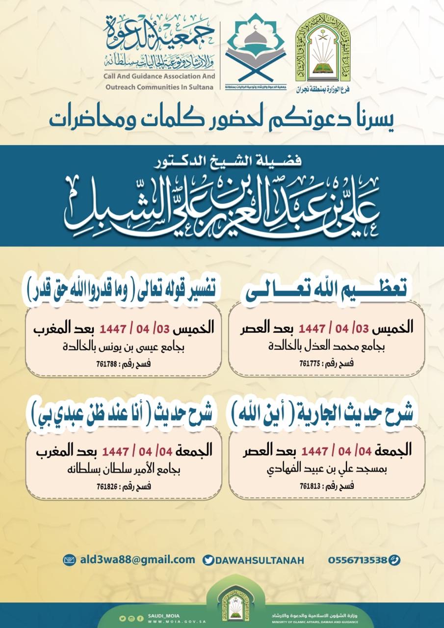 ​ينفذ فرع وزارة الشؤون الإسلامية والدعوة والإرشاد بمنطقة نجران، بالتعاون مع جمعية الدعوة والإرشاد وتوعية الجاليات بسلطانة، يومي الخميس والجمعة الثالث والرابع من شهر ربيع الآخر 1447هـ، سلسلة من المناشط