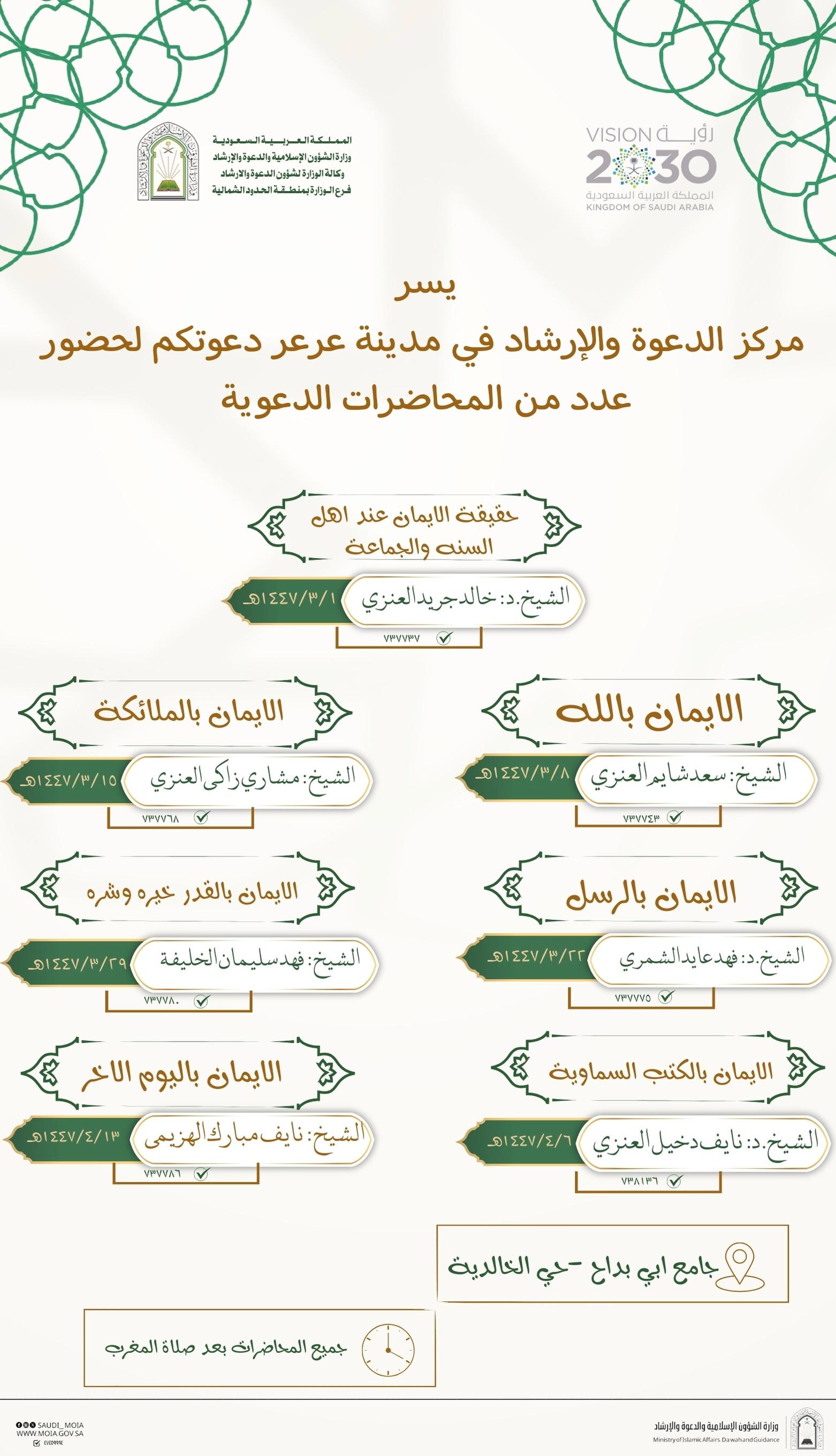 فرع الشؤون الإسلامية بالحدود الشمالية يطلق سلسلة محاضرات عن الإيمان وأركانهأطلق فرع وزارة الشؤون الإسلامية والدعوة والإرشاد بمنطقة الحدود الشمالية، ممثلاً بمركز الدعوة والإرشاد سلسلة من المحاضرات الدعوية خلال الفترة من الأول من شهر ربيع الأول حتى الثالث عشر من شهر ربيع الآخر 10/ربيع الأول/1447 التفاصيل
