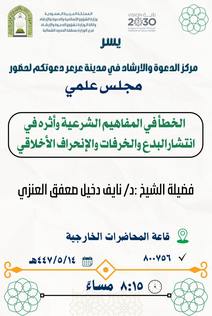 الشؤون الإسلامية بالحدود الشمالية تنظّم مجلسًا علميًا حول تصحيح المفاهيم الشرعية ومواجهة الانحرافات بعرعرنظّم فرع وزارة الشؤون الإسلامية والدعوة والإرشاد بمنطقة الحدود الشمالية، ممثلاً بمركز الدعوة والإرشاد بمدينة عرعر، مجلسًا علميًا بعنوان: "الخطأ في المفاهيم الشرعية وأثره في انتشار البدع والانحرافات 15/جمادى الأولى/1447 التفاصيل