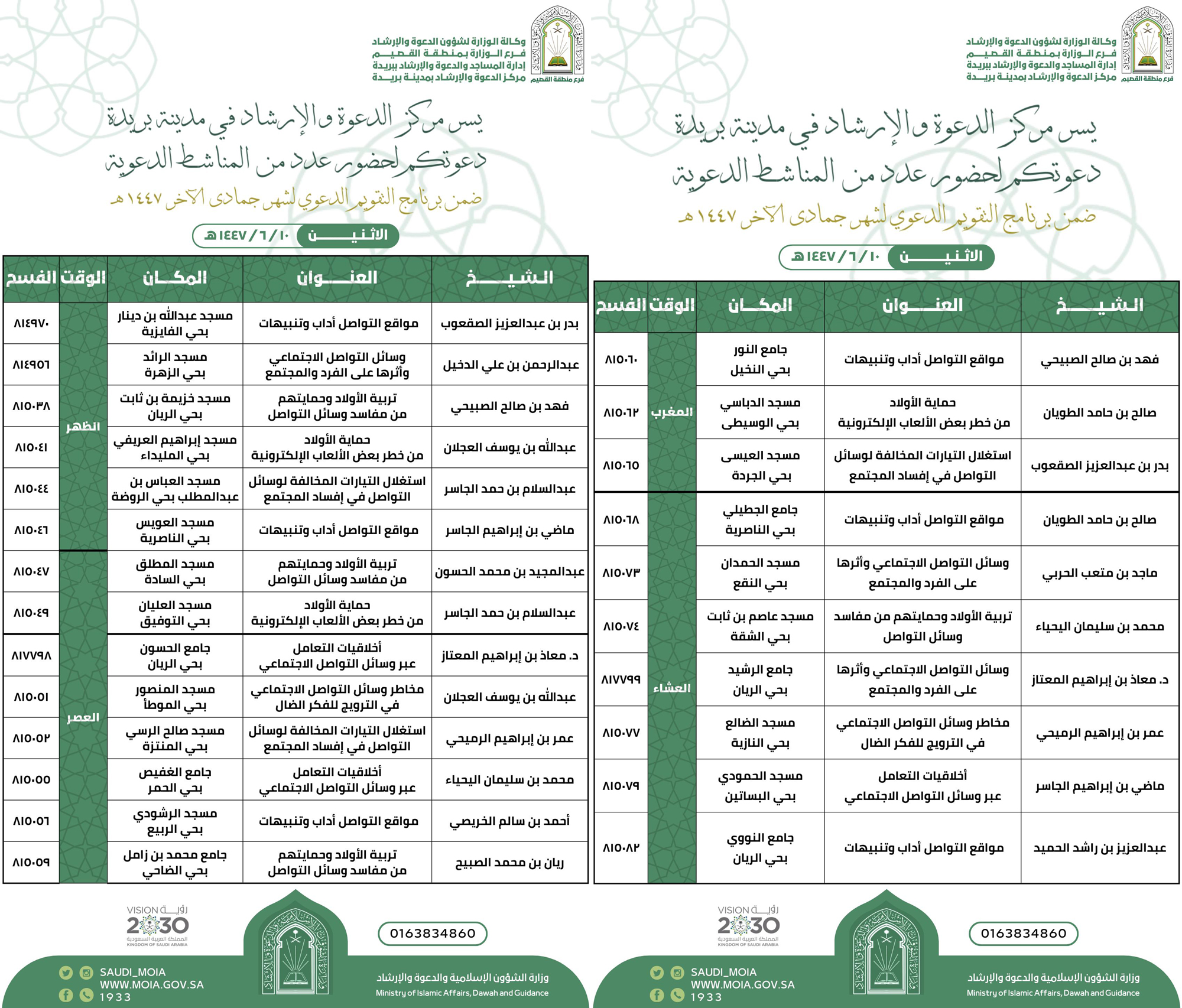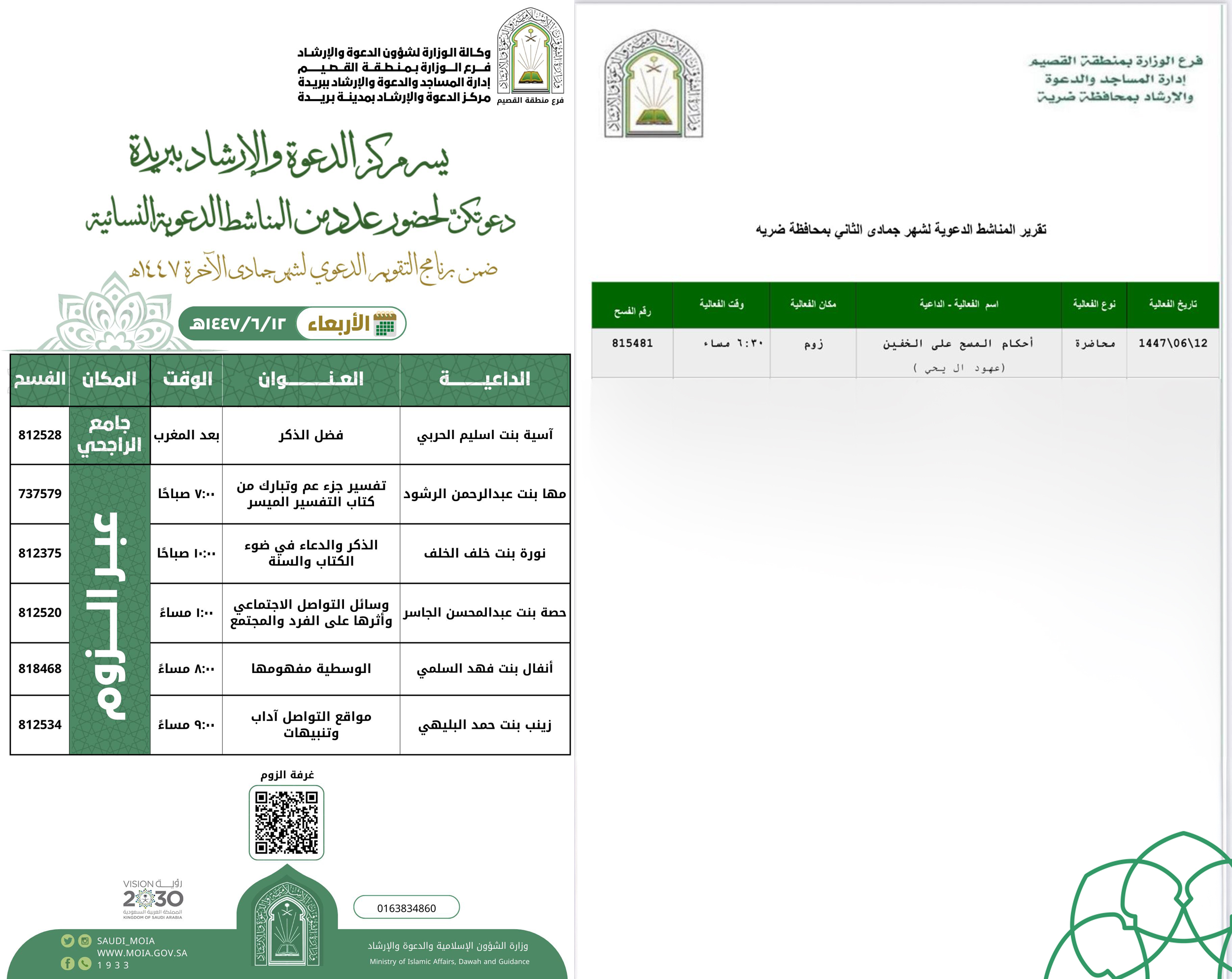 الشؤون الإسلامية بالقصيم تنفذ عدداً من المناشط النسائية بمدينة بريدةتنفذ وزارة الشؤون الإسلامية والدعوة والإرشاد ممثلة بفرعها في منطقة القصيم، ممثلاً بمركز الدعوة والإرشاد بمدينة بريدة، ينفذ عدداً من المناشط النسائية، اليوم الأحد ٩ جمادى الآخرة 1447هـ. وتشمل هذه 09/جمادى الثانية/1447 التفاصيل