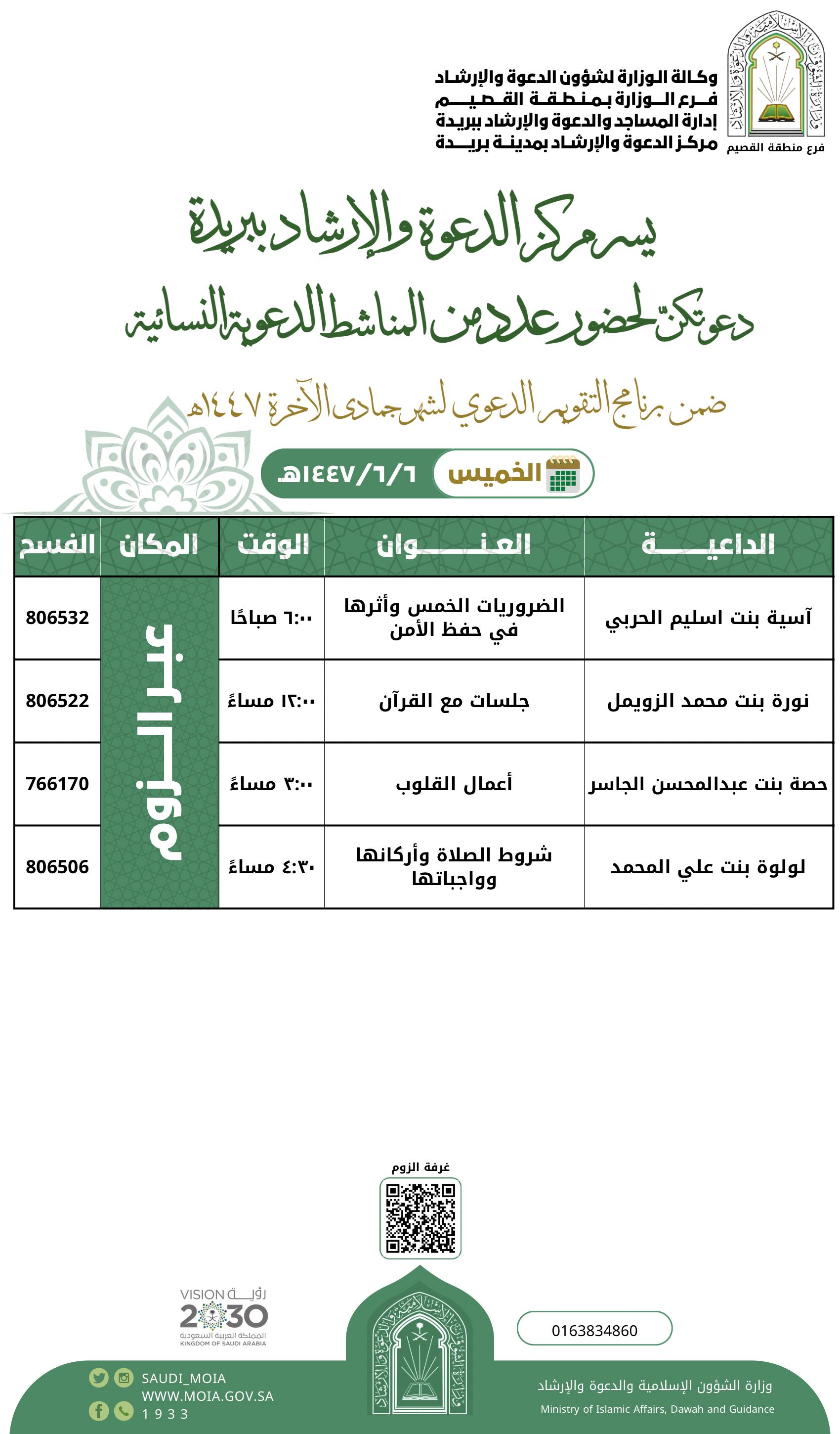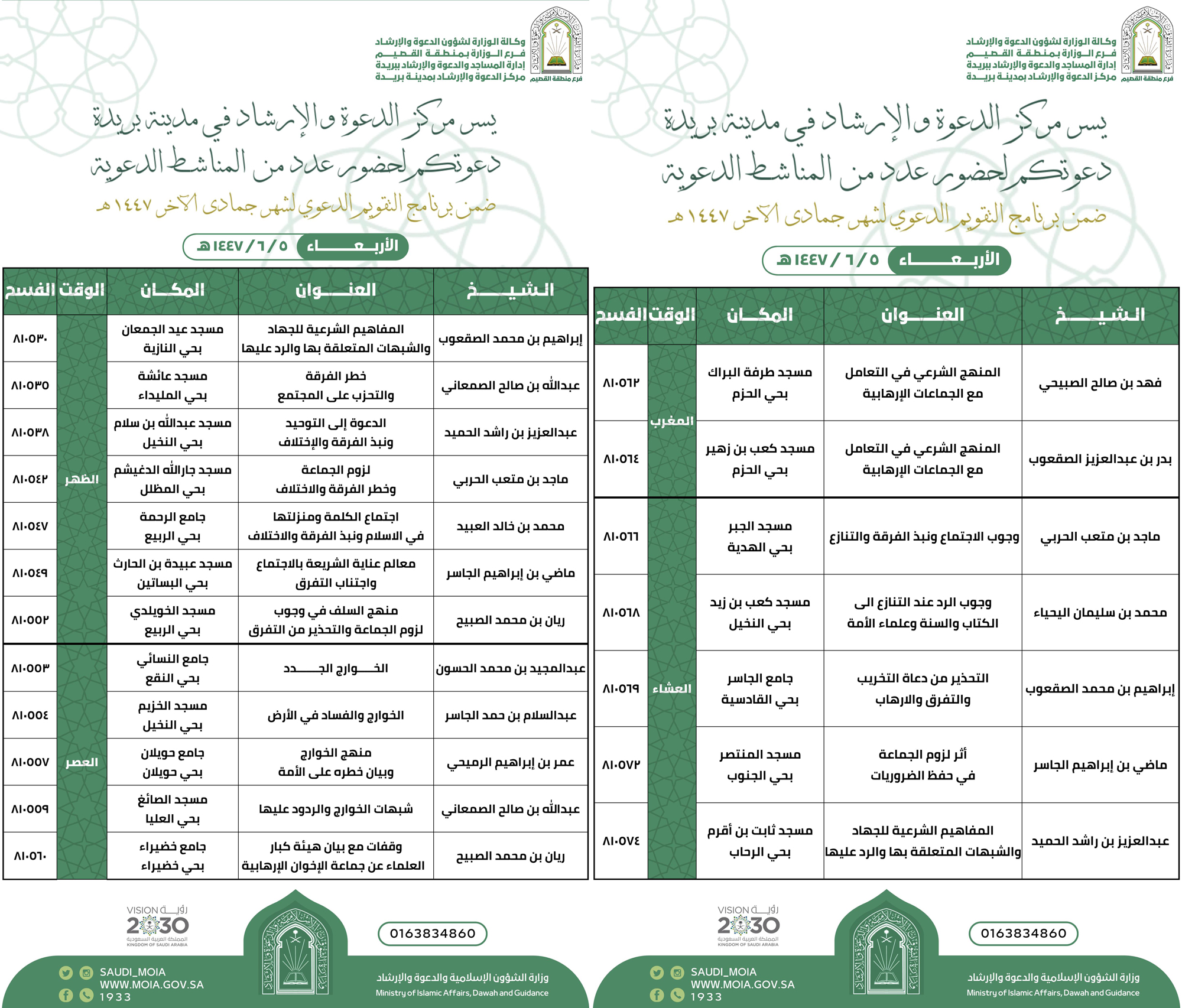 الشؤون الإسلامية بالقصيم تنفذ عدداً من المناشط الدعوية بمدينة بريدةينفذ فرع وزارة الشؤون الإسلامية والدعوة والإرشاد بمنطقة القصيم، ممثلاً بمركز الدعوة والإرشاد بمدينة بريدة، اليوم الخميس 29 جمادى الأولى 1447هـ عددًا من المناشط الدعوية " ضمن برنامج التقويم 29/جمادى الأولى/1447 التفاصيل