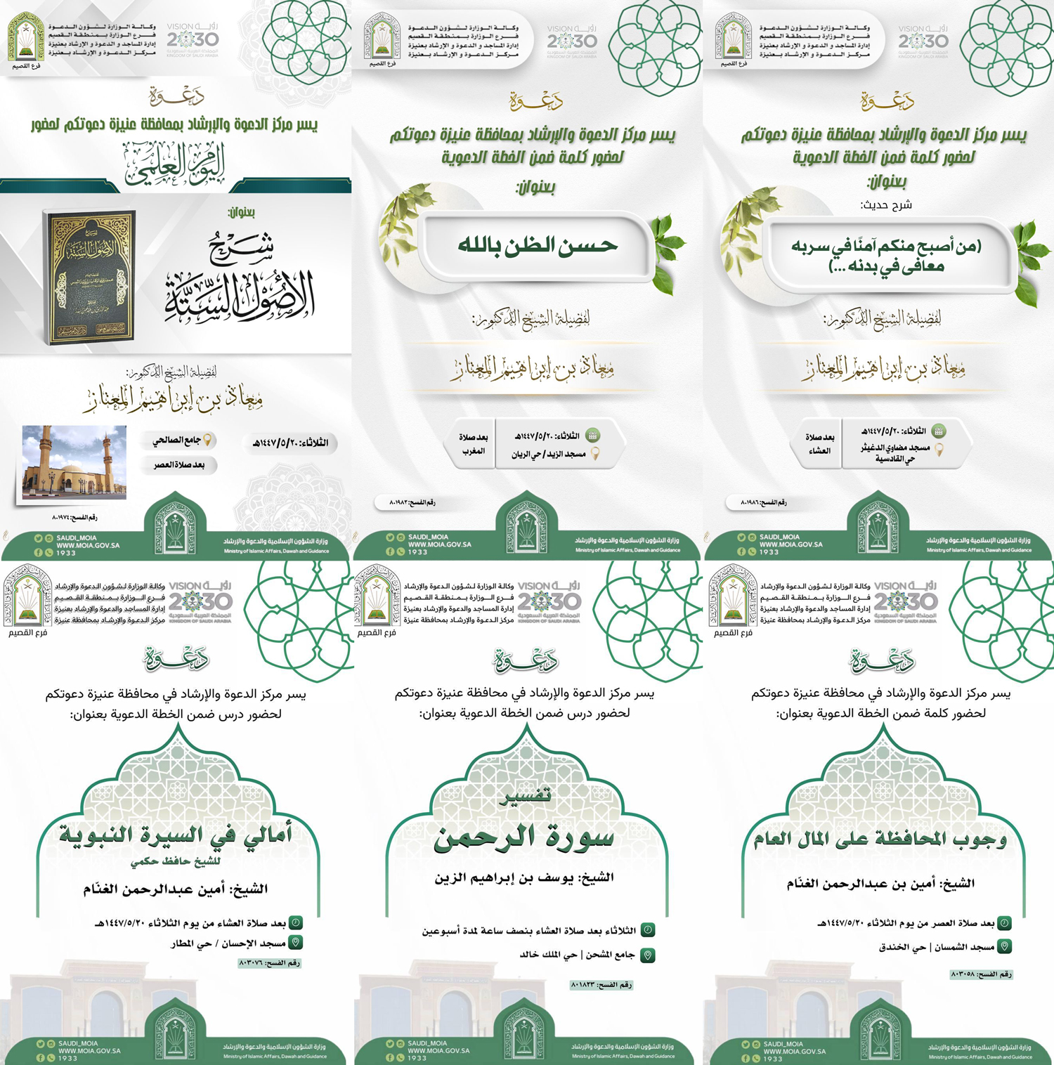 الشؤون الإسلامية بالقصيم تنفذ عدداً من المناشط الدعوية بمحافظة عنيزةينفذ فرع وزارة الشؤون الإسلامية والدعوة والإرشاد بمنطقة القصيم، ممثلاً بمركز الدعوة والإرشاد بمحافظة عنيزة، اليوم الثلاثاء 20 جمادى الأولى 1447هـ، برنامجًا دعويًا تضمن عددًا من المناشط الدعوية، تقام 20/جمادى الأولى/1447 التفاصيل