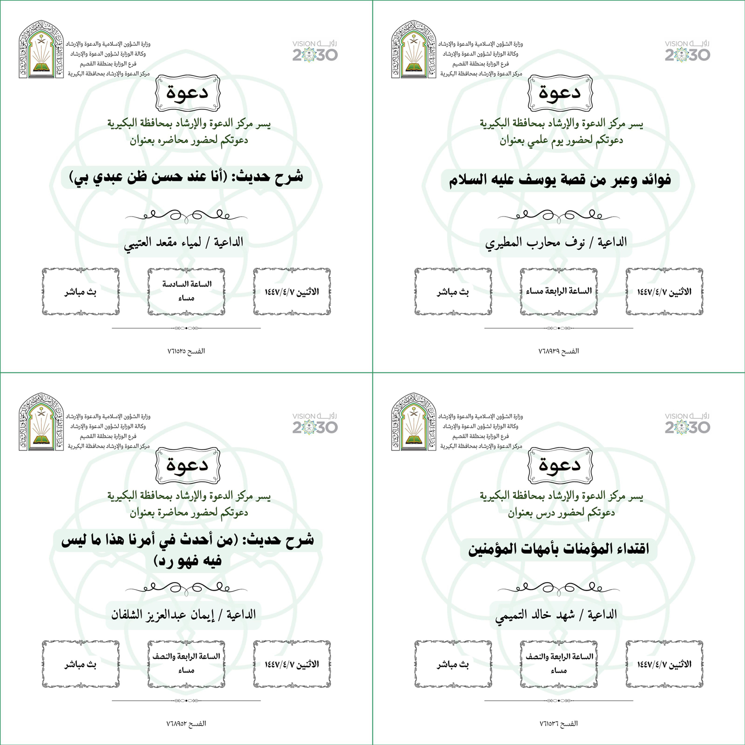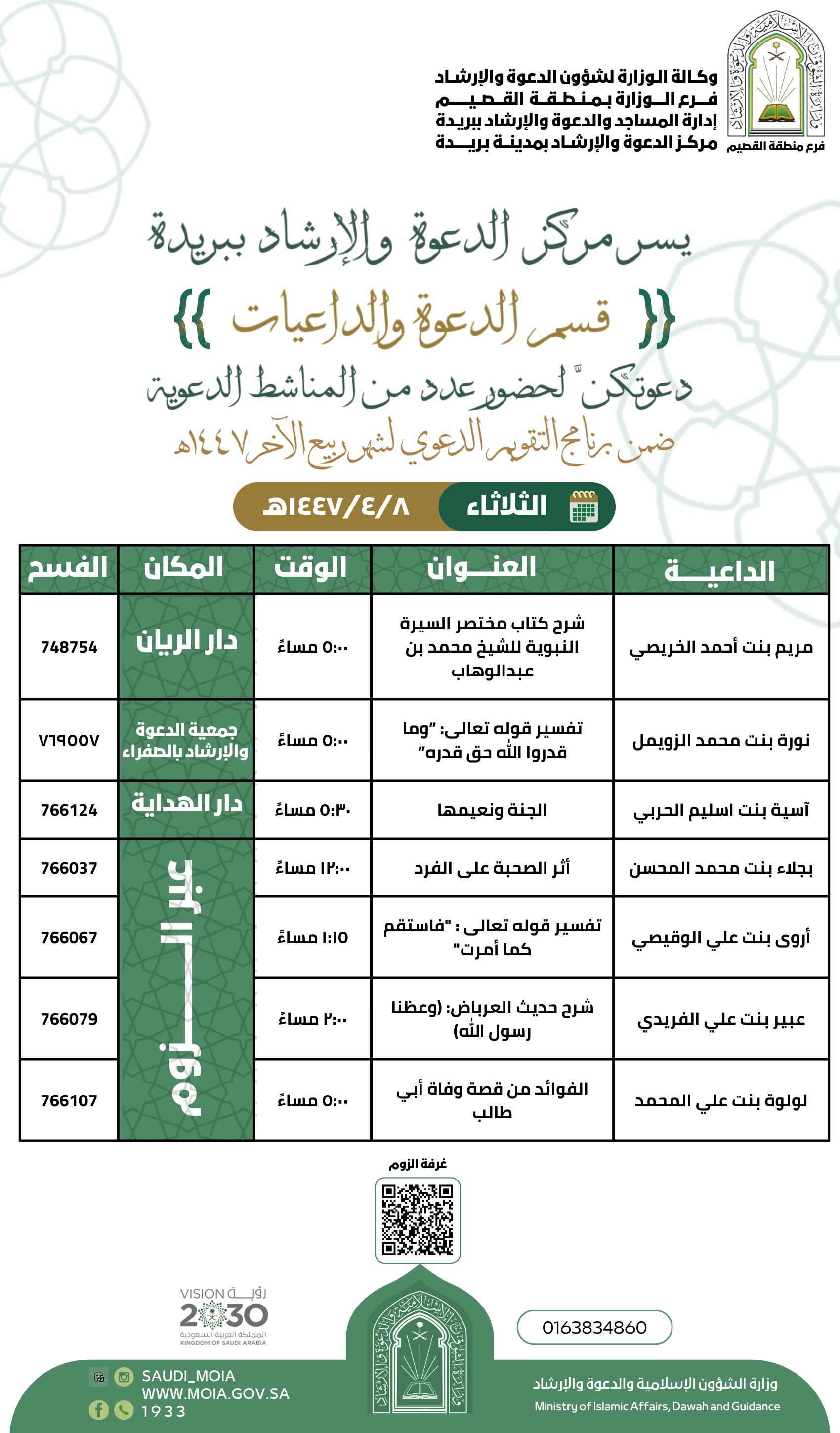 الشؤون الإسلامية بالقصيم تنفذ عدداً من المناشط الدعوية النسائية بمحافظة البكيريةيواصل فرع وزارة الشؤون الإسلامية والدعوة والإرشاد بمنطقة القصيم، ممثلاً بمركز الدعوة والإرشاد بمحافظة البكيرية، تنفيذ عددٍ من البرامج الدعوية النسائية، حيث ينظم المركز الاثنين 7 ربيع الآخر 1447هـ مجموعة 09/ربيع الثاني/1447 التفاصيل