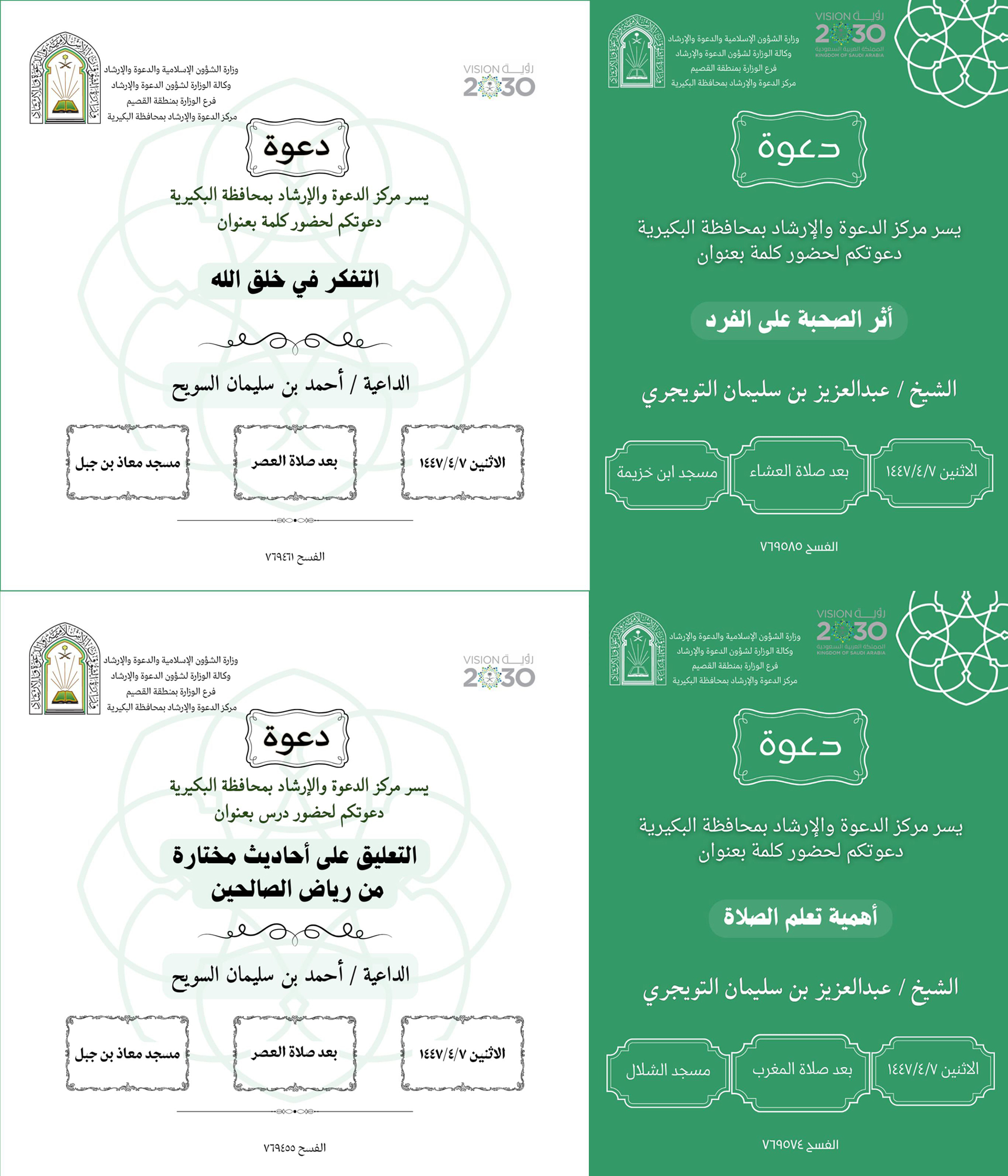 محاضرات دعوية وعلمية ينفذها فرع الشؤون الإسلامية بالقصيم بمحافظة البكيريةيواصل فرع وزارة الشؤون الإسلامية والدعوة والإرشاد بمنطقة القصيم ممثلاً بمركز الدعوة والإرشاد بمحافظة البكيرية تنفيذ برامجه الدعوية، حيث يُنظَّم الاثنين 7 ربيع الآخر 1447هـ، درس ومجموعة من الكلمات الوعظية 09/ربيع الثاني/1447 التفاصيل