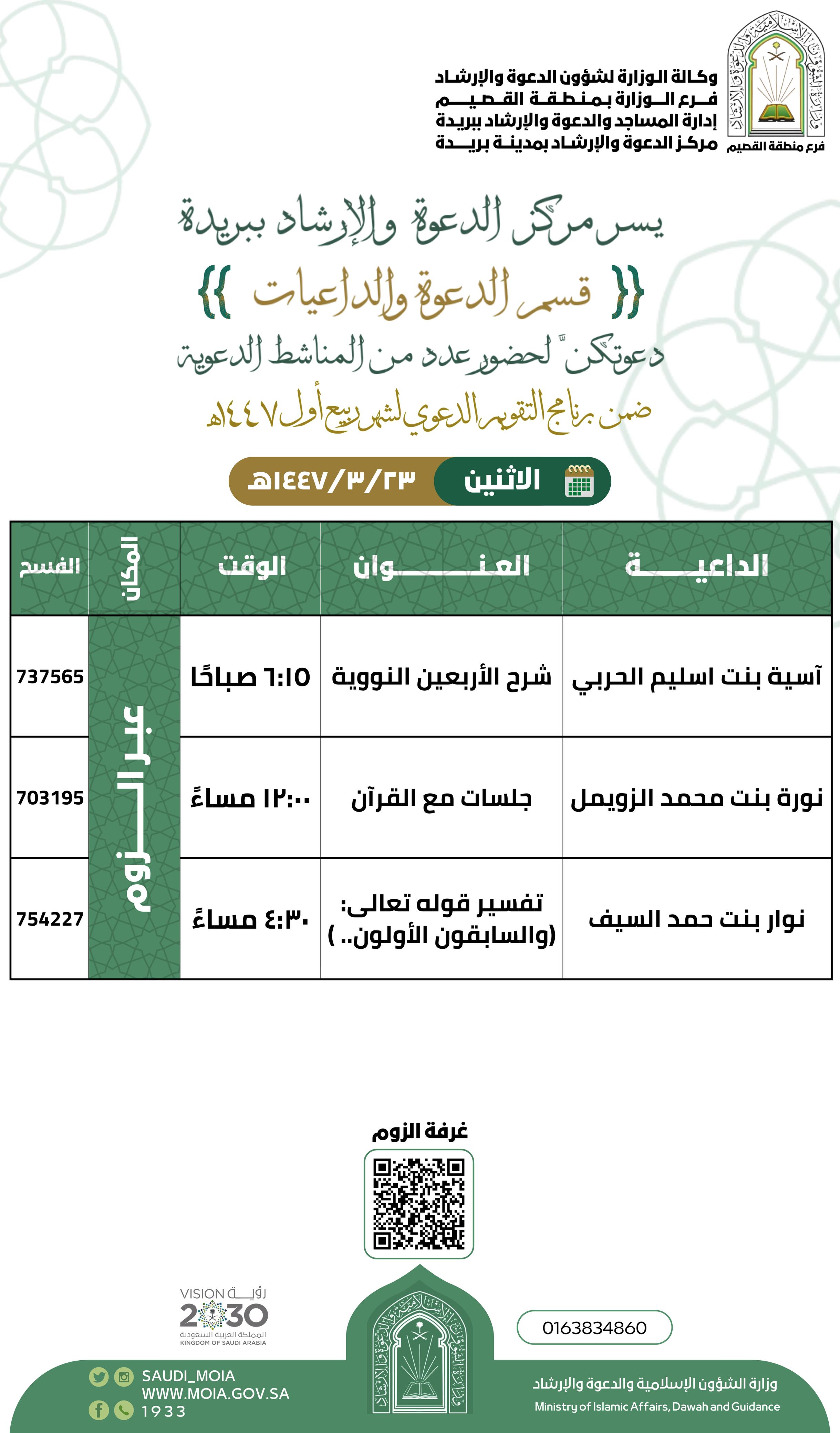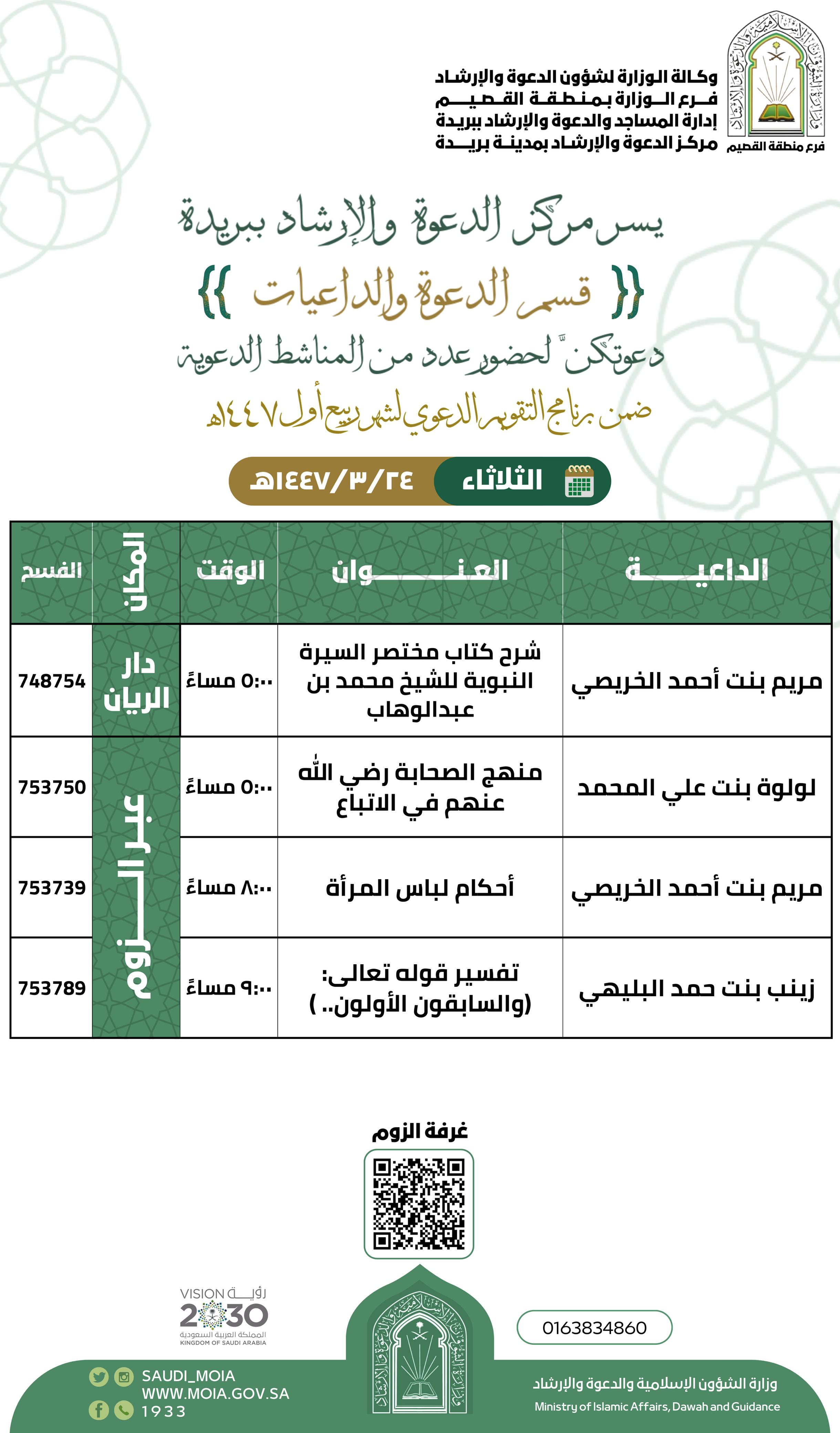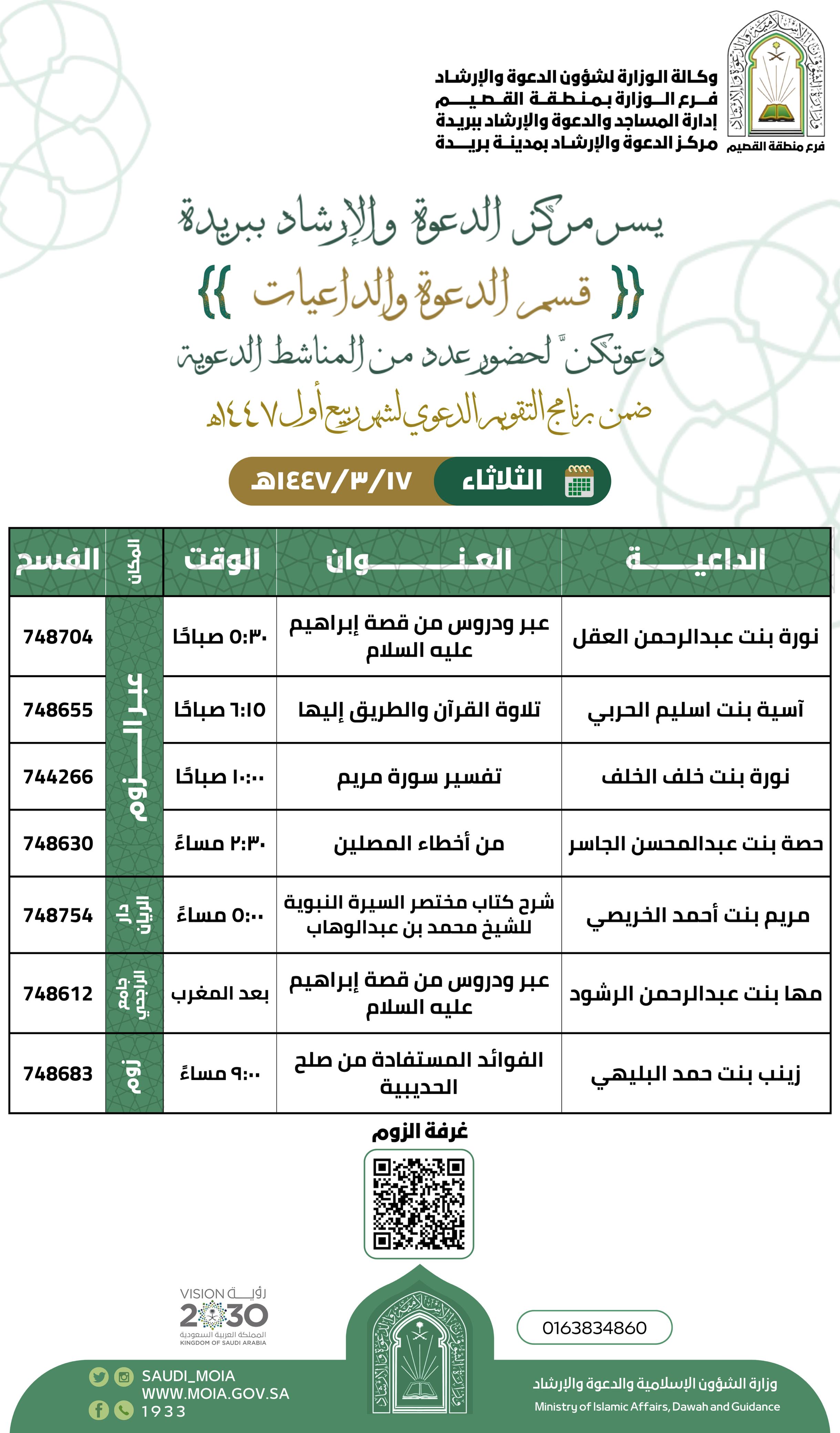 الشؤون الإسلامية بالقصيم تنفذ عدداً من المناشط الدعوية النسائيةيواصل فرع وزارة الشؤون الإسلامية والدعوة والإرشاد بمنطقة القصيم، ممثلاً بمركز الدعوة والإرشاد بمدينة بريدة، تنفيذ عددٍ من البرامج الدعوية النسائية، حيث ينظم المركز يوم الثلاثاء الموافق 17 ربيع الأول 18/ربيع الأول/1447 التفاصيل