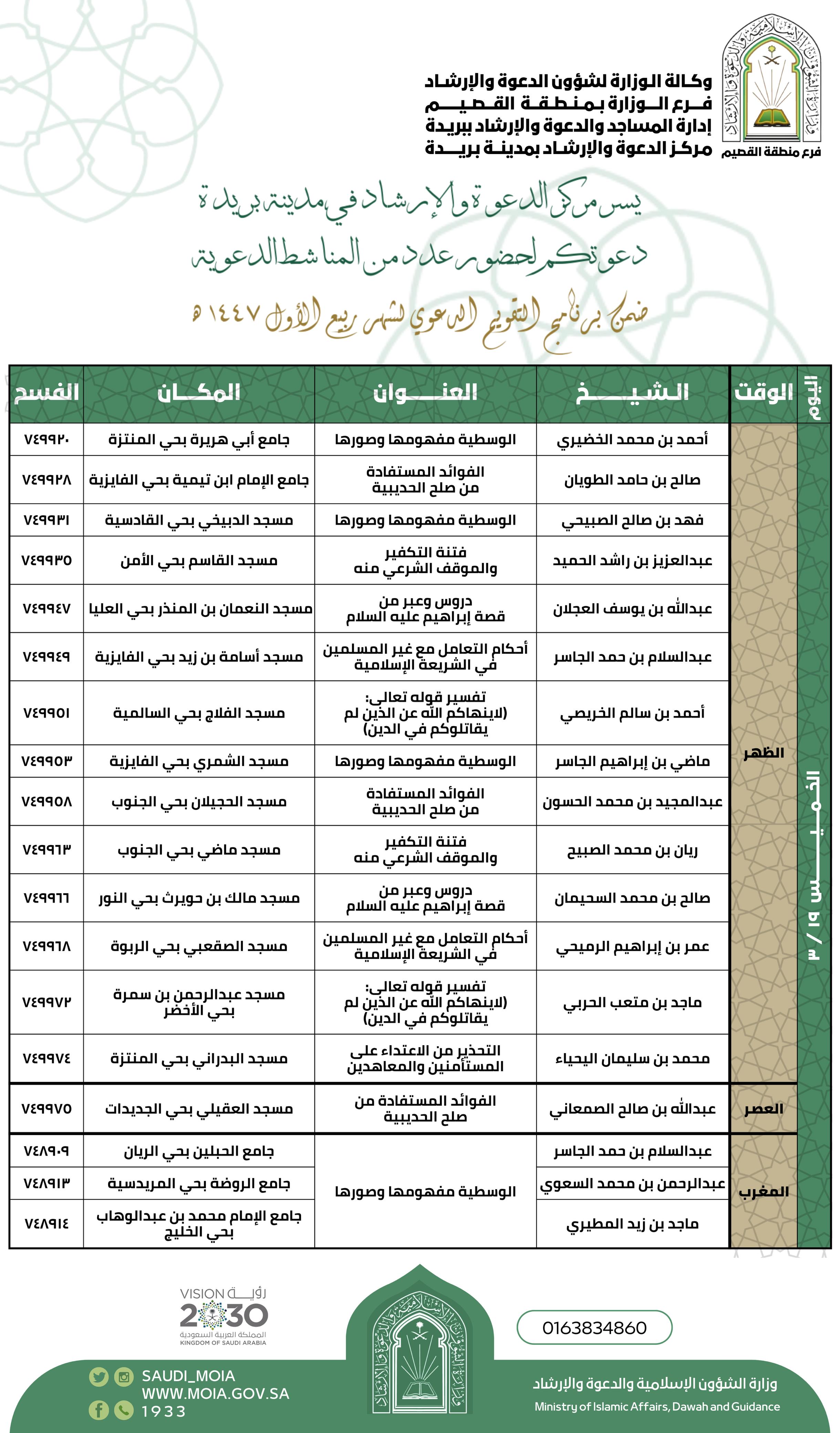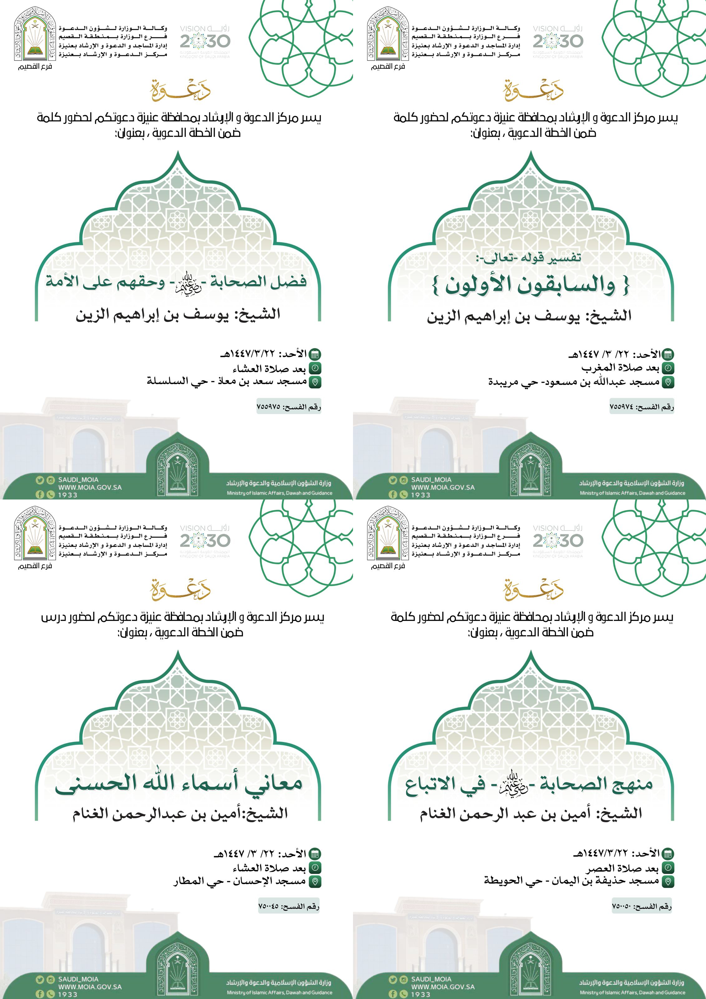 الشؤون الإسلامية بالقصيم تنفذ محاضرات ودروس وكلمات وعظيه بعنيزةيواصل فرع وزارة الشؤون الإسلامية والدعوة والإرشاد بمنطقة القصيم ممثلاً بمركز الدعوة والإرشاد بعنيزة تنفيذ برامجه الدعوية، حيث يُنظَّم اليوم الأحد 22 ربيع الأول 1447هـ، مجموعة المحاضرات والدروس والكلمات 22/ربيع الأول/1447 التفاصيل