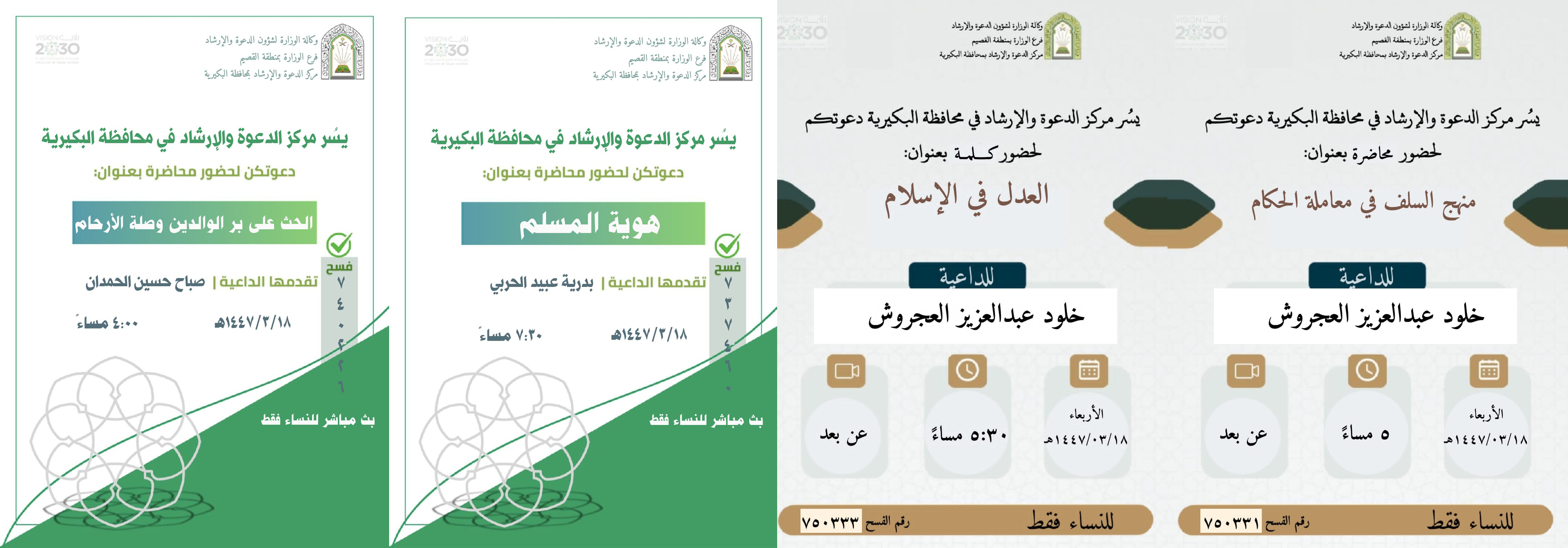 الشؤون الإسلامية بالقصيم تنفذ عدداً من المناشط الدعوية النسائية بالبكيريةيواصل فرع وزارة الشؤون الإسلامية والدعوة والإرشاد بمنطقة القصيم، ممثلاً بمركز الدعوة والإرشاد بمحافظة البكيرية، تنفيذ عددٍ من البرامج الدعوية النسائية، حيث ينظم المركز اليوم الأربعاء الموافق 18 ربيع الأول 18/ربيع الأول/1447 التفاصيل
