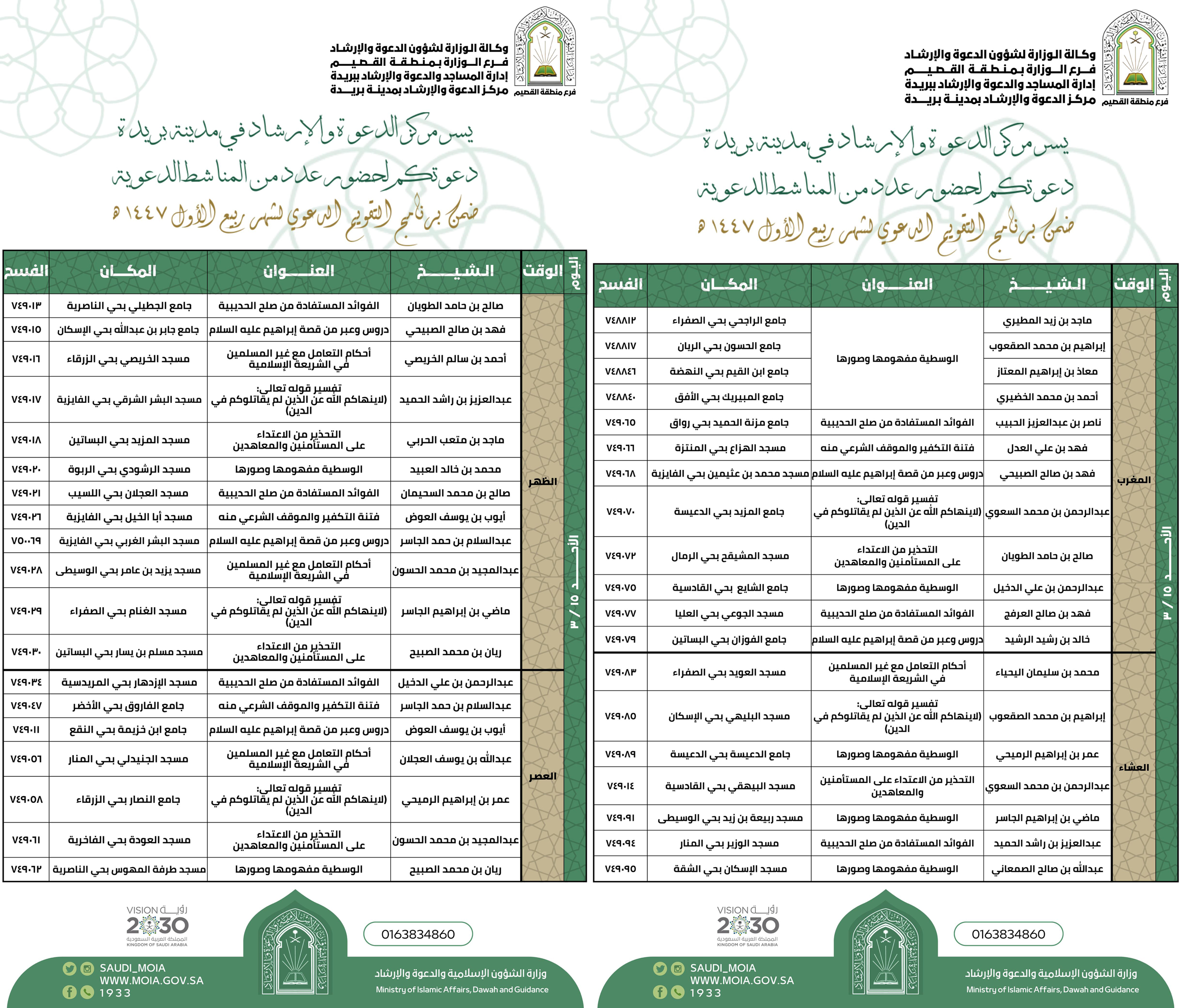 الشؤون الإسلامية بالقصيم تنفذ عدداً من المناشط الدعوية النسائيةيواصل فرع وزارة الشؤون الإسلامية والدعوة والإرشاد بمنطقة القصيم، ممثلاً بمركز الدعوة والإرشاد بمدينة بريدة، تنفيذ عددٍ من البرامج الدعوية النسائية، حيث ينظم المركز اليوم الاثنين الموافق 9 ربيع الأول 1447هـ 09/ربيع الأول/1447 التفاصيل