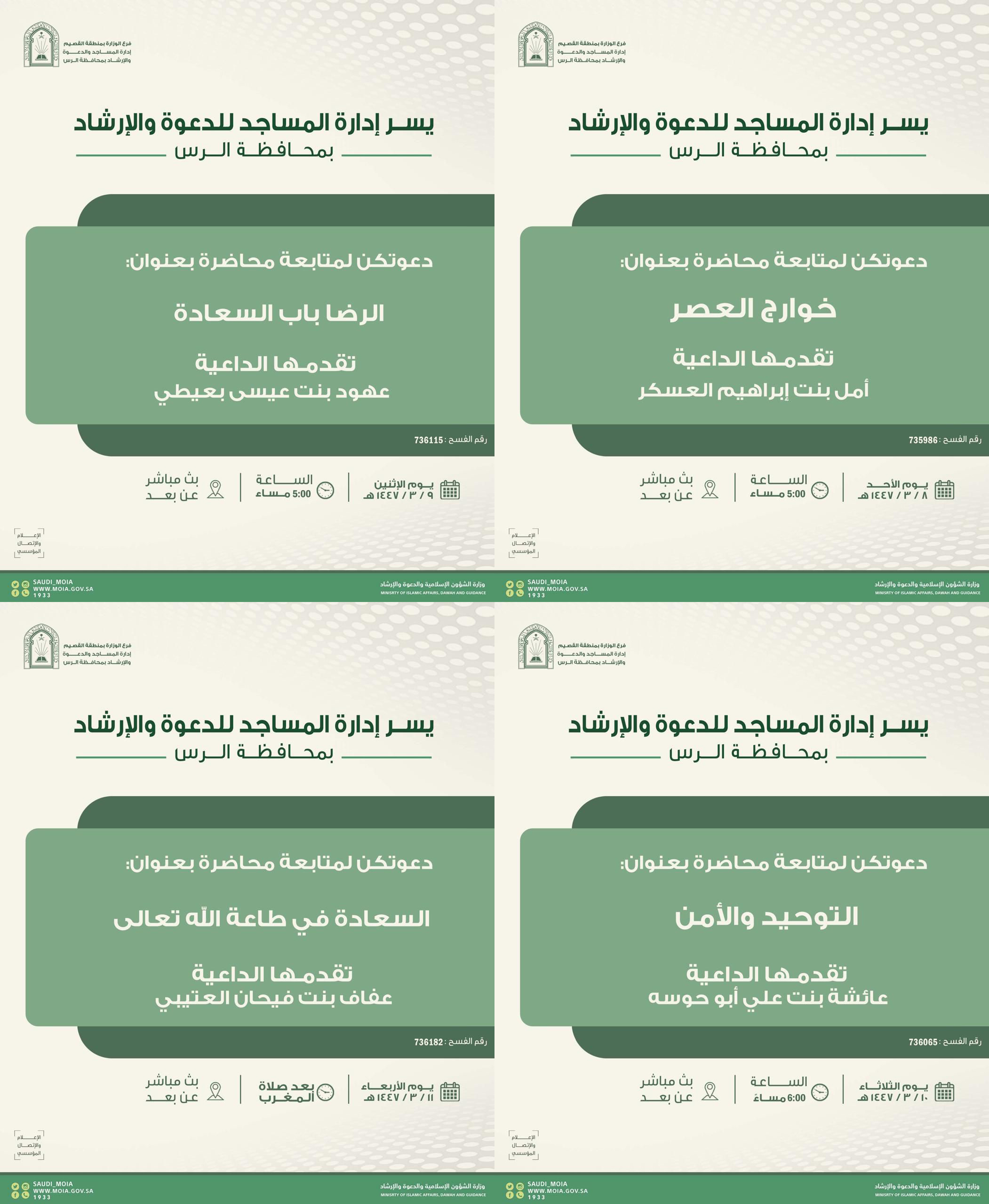 الشؤون الإسلامية بالقصيم تنفذ مناشط دعوية نسائية بمحافظة الرسنفّذ فرع وزارة الشؤون الإسلامية والدعوة والإرشاد بمنطقة القصيم، ممثلاً بإدارة المساجد والدعوة والإرشاد بمحافظة الرس، مجموعة من المحاضرات والدروس الدعوية النسائية عن بُعد عبر برنامج (زووم)، خلال الفترة 15/ربيع الأول/1447 التفاصيل