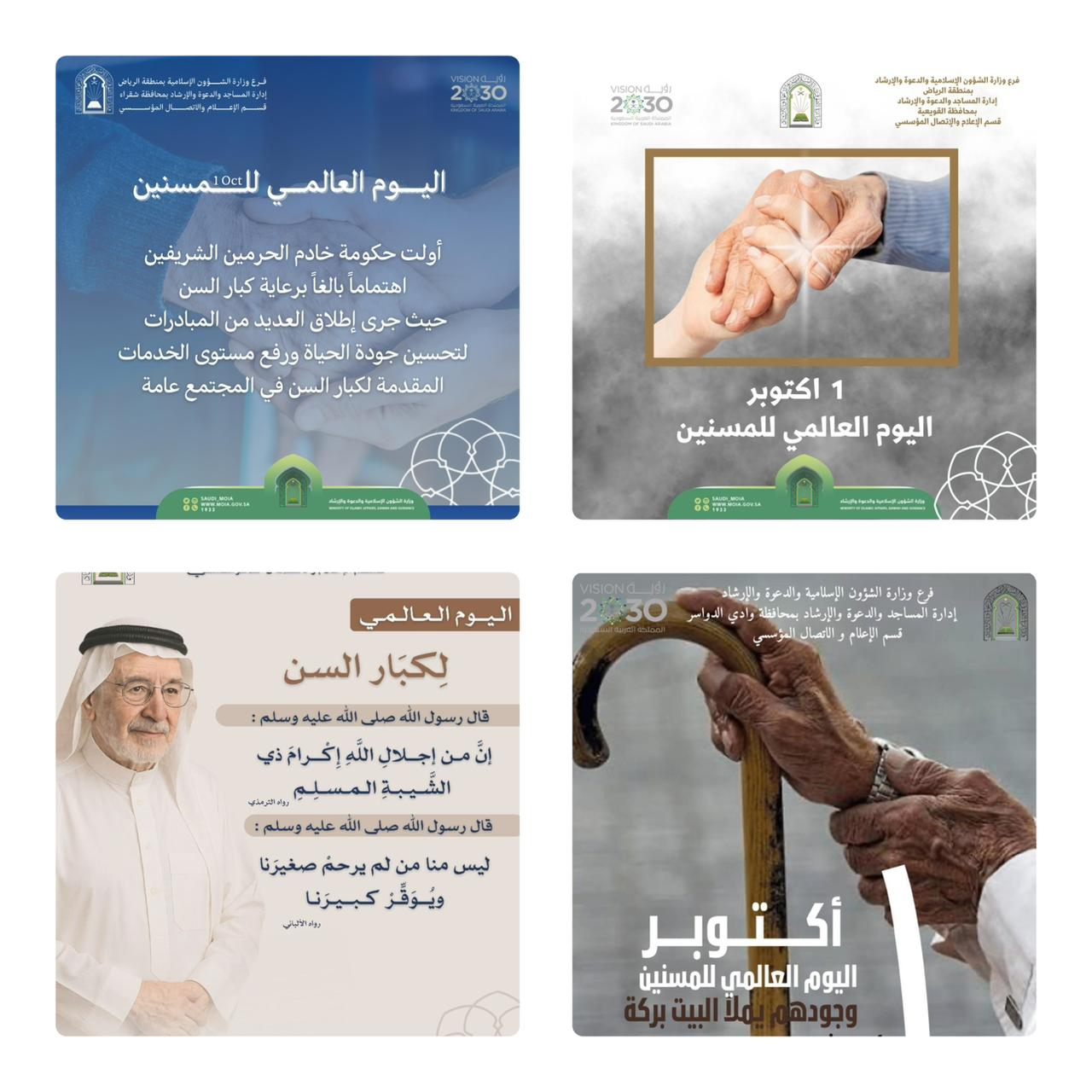 فرع وزارة الشؤون الإسلامية والدعوة والإرشاد بمنطقة الرياض يشارك في اليوم العالمي للمسنينشارك فرع وزارة الشؤون الإسلامية والدعوة والإرشاد بمنطقة الرياض، في اليوم العالمي للمسنين، الذي يصادف الأول من أكتوبر من كل عام، في عدد من محافظات المنطقة، من خلال إعداد ونشر تصاميم توعوية ومحتوى إعلامي 09/ربيع الثاني/1447 التفاصيل