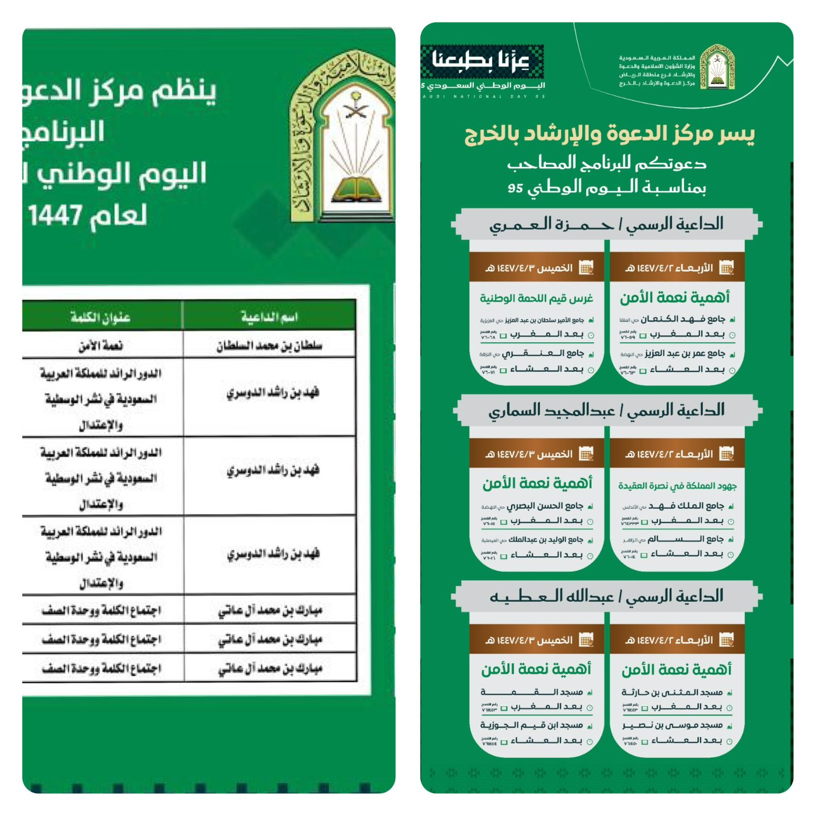 الشؤون الإسلامية بالرياض تنظّم برنامجاً دعوياً بمناسبة اليوم الوطني الـ95 بالخرج والأفلاجنظّم فرع وزارة الشؤون الإسلامية والدعوة والإرشاد بمنطقة الرياض ممثلاً بمركزي الدعوة والإرشاد في محافظتي الخرج والأفلاج، سلسلة من المحاضرات الدعوية ضمن برنامج الانتماء الوطني، وذلك احتفاءً باليوم الوطني 30/ربيع الأول/1447 التفاصيل