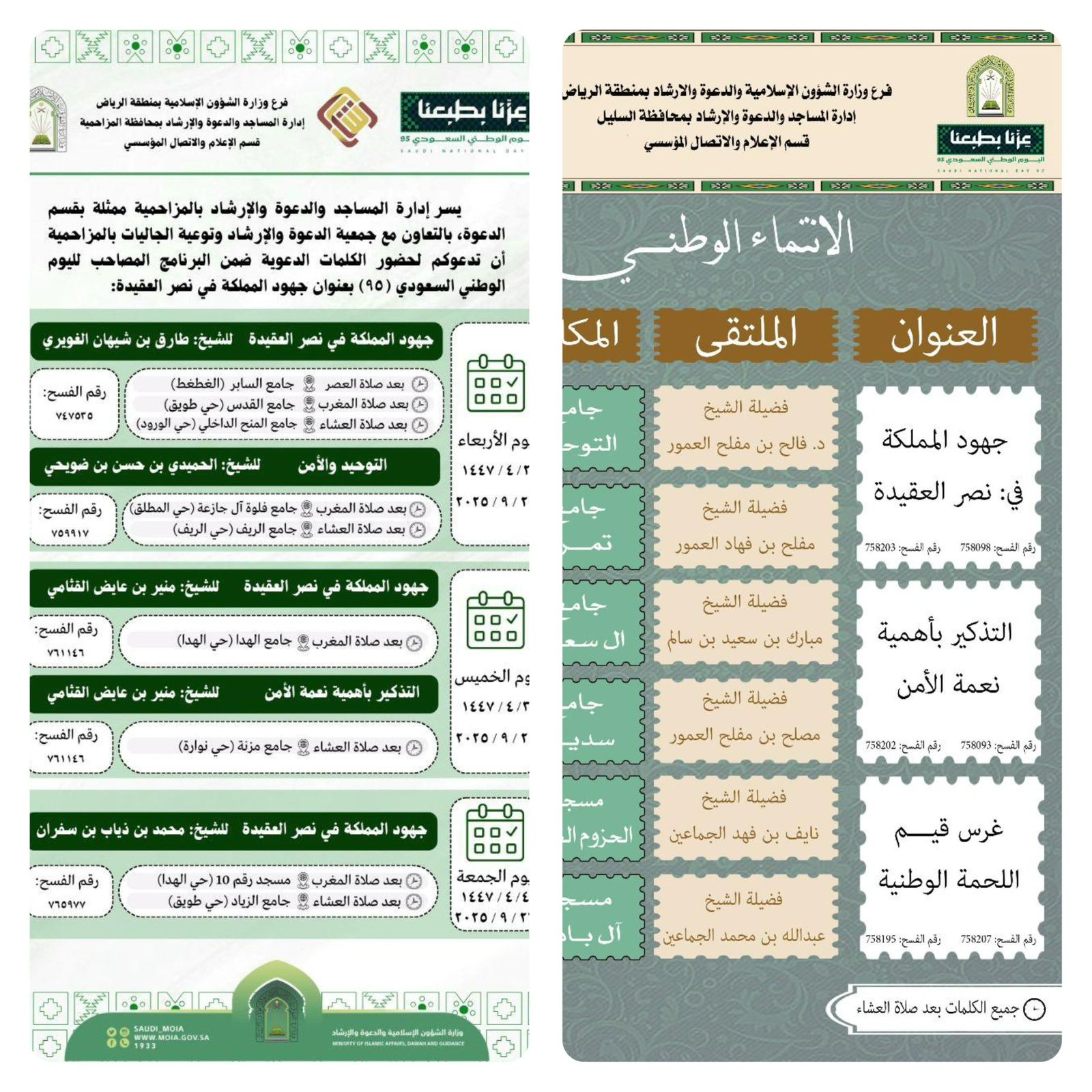 الشؤون الإسلامية بالرياض تنفذ برنامجاً دعوياً باليوم الوطني الـ95نفّذ فرع وزارة الشؤون الإسلامية والدعوة والإرشاد بمنطقة الرياض، ممثلاً بمراكز الدعوة والإرشاد في المزاحمية وعفيف والسليل، برنامجاً دعوياً بمناسبة اليوم الوطني السعودي الـ95، تضمن سلسلة من المحاضرات في 03/ربيع الثاني/1447 التفاصيل