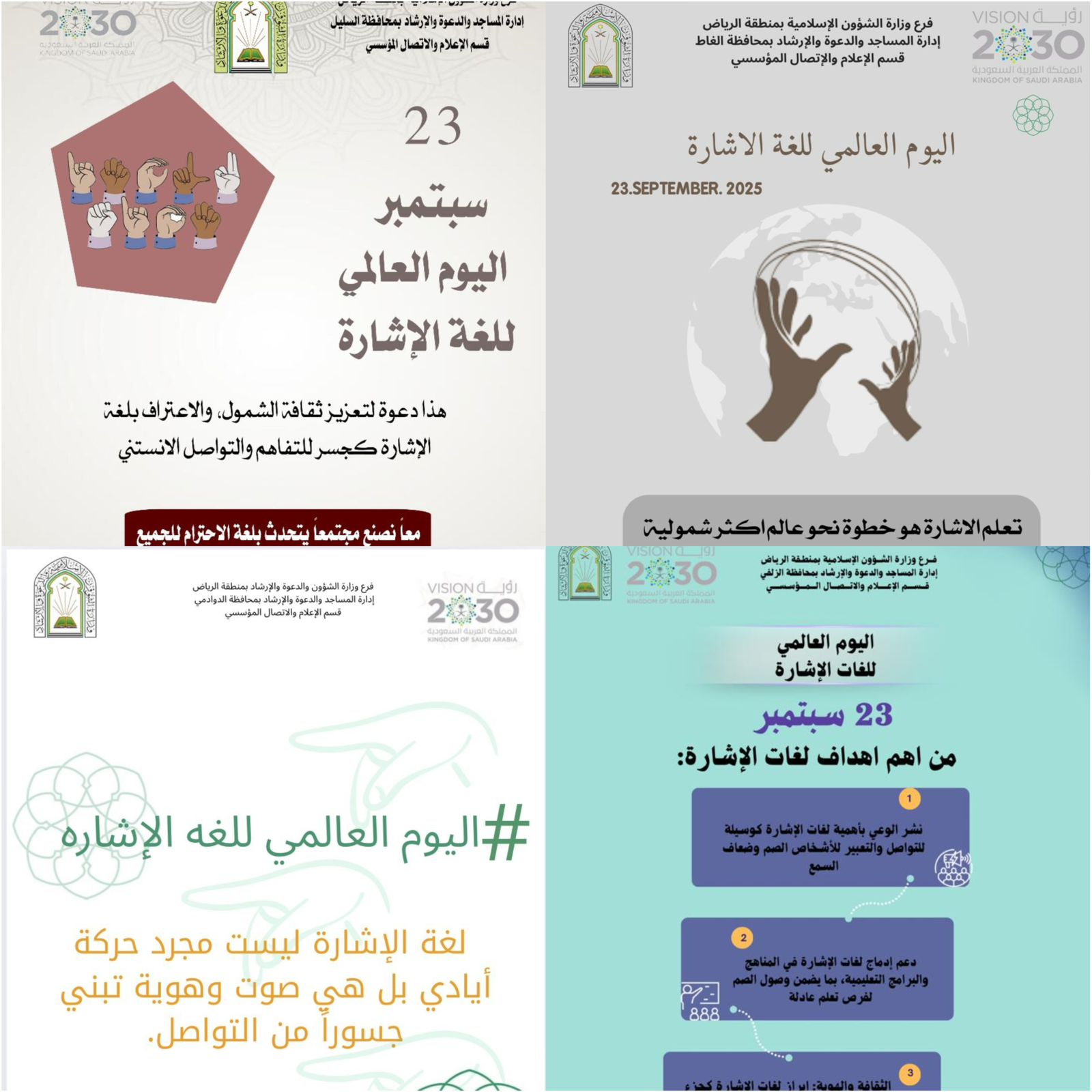 رع الشؤون الإسلامية بالرياض يشارك في اليوم العالمي للغات الإشارة بعدد من المحافظاتشارك فرع وزارة الشؤون الإسلامية والدعوة والإرشاد بمنطقة الرياض، ممثلاً بإدارات المساجد والدعوة والإرشاد في عددٍ من المحافظات، في إحياء اليوم العالمي للغات الإشارة الذي يوافق 23 سبتمبر من كل عام، وذلك 02/ربيع الثاني/1447 التفاصيل