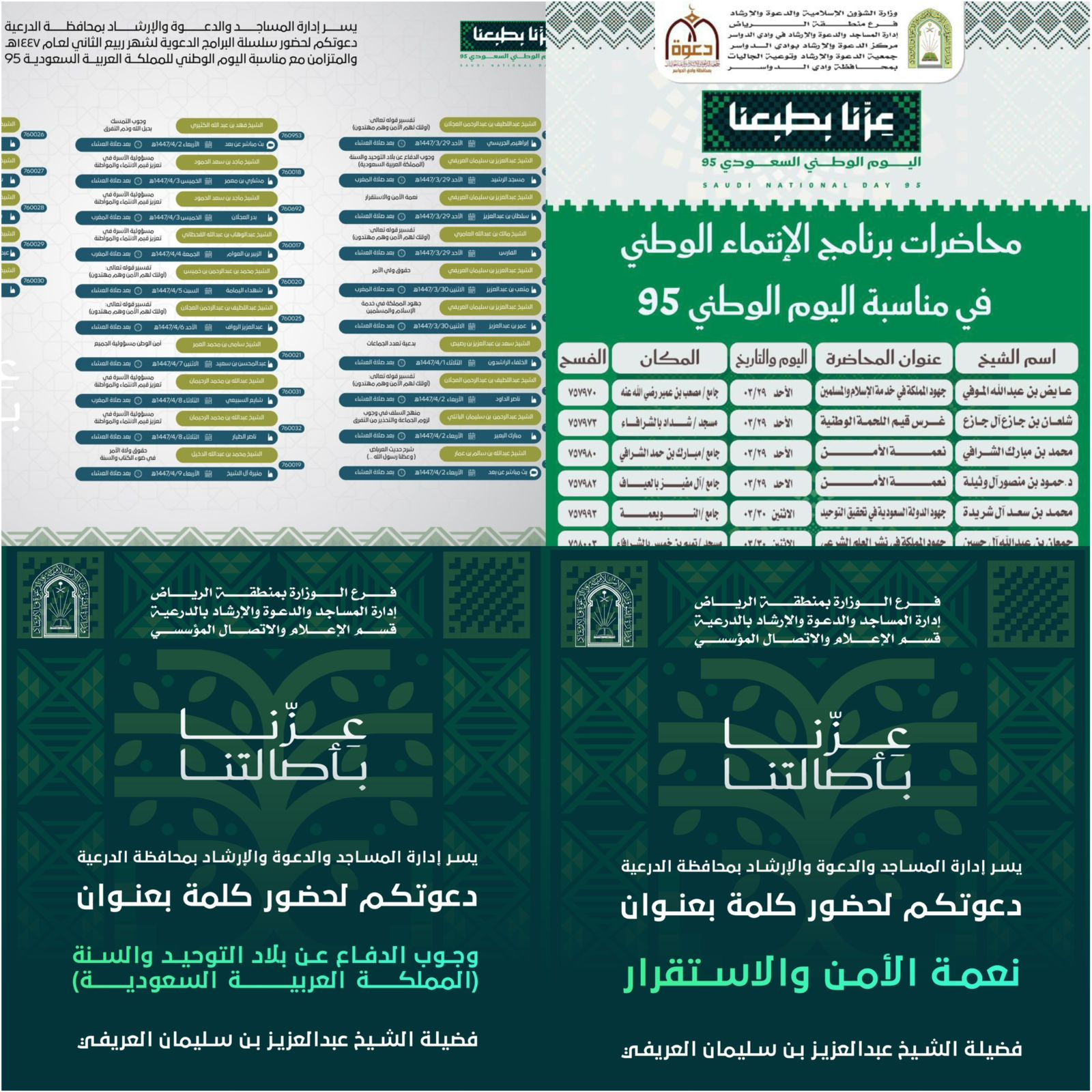 ينفذ فرع وزارة الشؤون الإسلامية والدعوة والإرشاد بمنطقة الرياض، ممثلاً بمحافظتي وادي الدواسر والدرعية، سلسلة من المحاضرات الدعوية ضمن برنامج الانتماء الوطني، احتفاءً باليوم الوطني السعودي الـ95. وتُقام