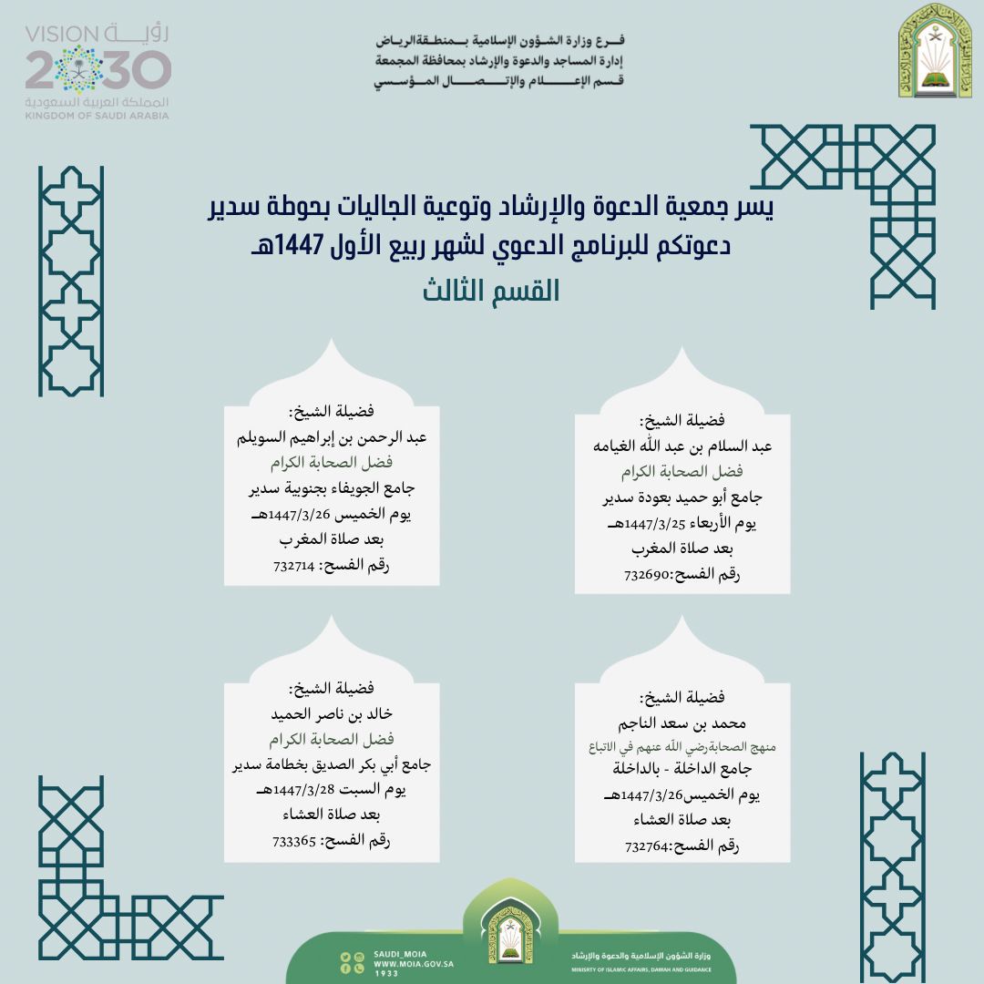 • فرع الشؤون الإسلامية بحوطة سدير ينفذ البرنامج الدعوي لشهر ربيع الأول 1447هـ