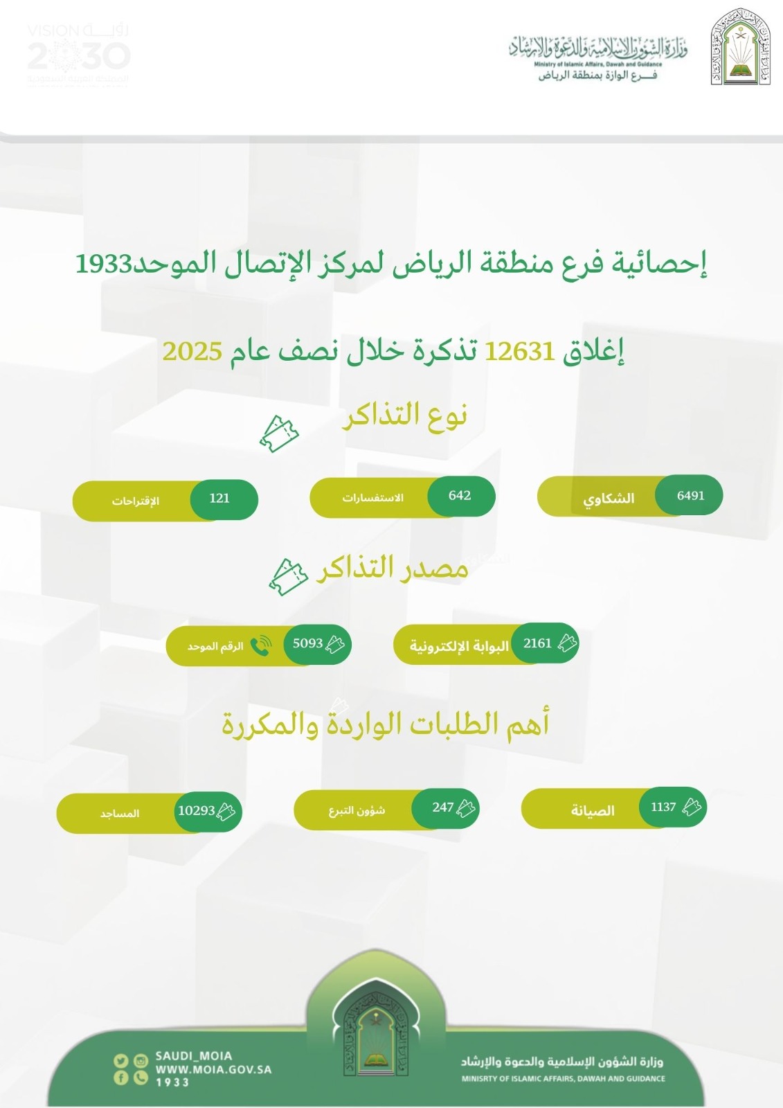 أغلق فرع وزارة الشؤون الإسلامية والدعوة والإرشاد بمنطقة الرياض خلال النصف الأول من عام 2025م 12,631 تذكرة عبر قسم الاتصال الموحد (1933)، شملت شكاوى واستفسارات ومقترحات من المواطنين والمقيمين. وبيّن الفرع