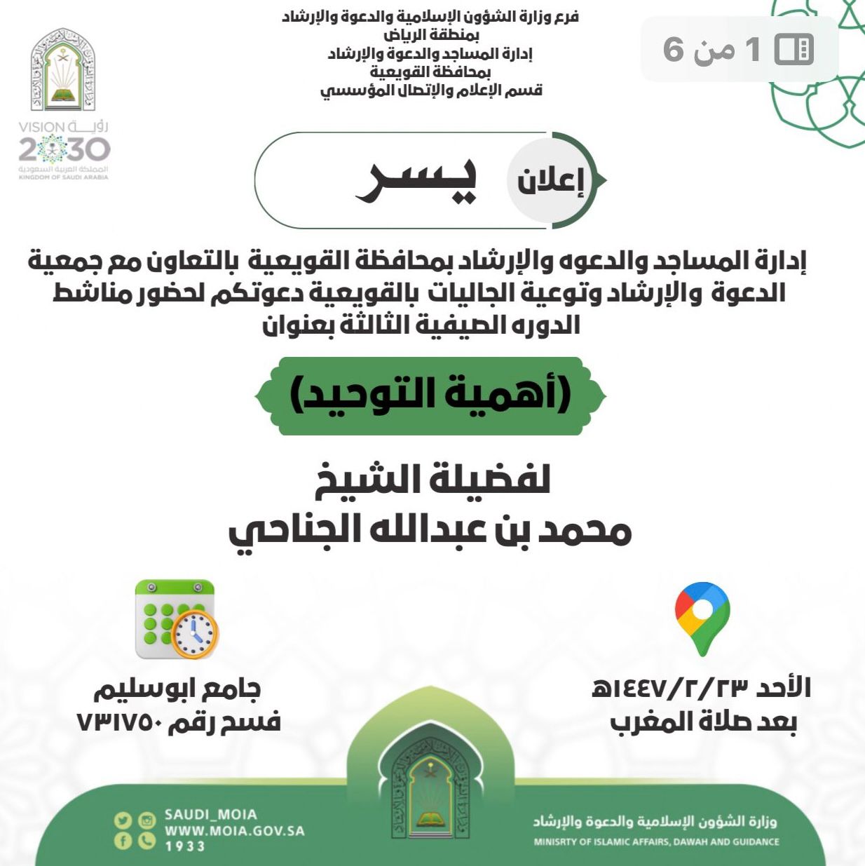 ​​​​نظّم فرع وزارة الشؤون الإسلامية والدعوة والإرشاد بمنطقة الرياض، ممثلاً بأقسام الدعوة بإدارات المساجد في عدد من المحافظات يوم الثلاثاء 18 صفر 1447هـ، سلسلة من المحاضرات والكلمات الدعوية التي تناولت