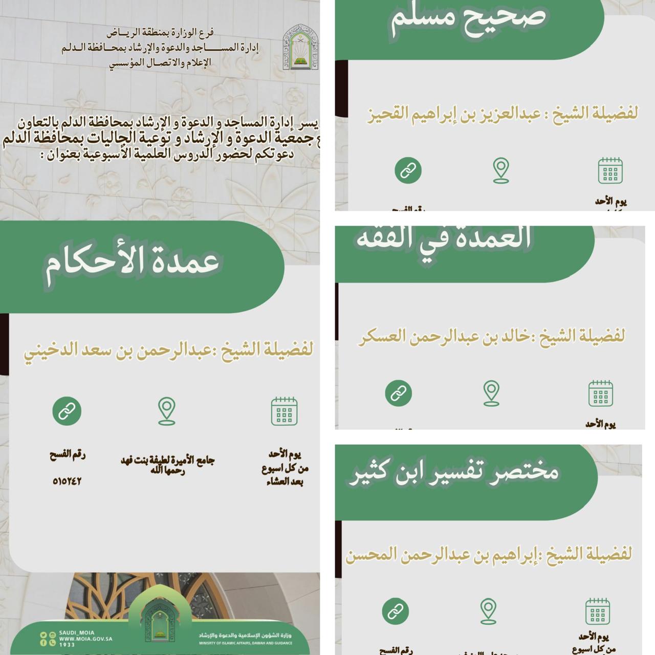 نفّذ فرع وزارة الشؤون الإسلامية والدعوة والإرشاد بالرياض في محافظة الدلم، أمس الأحد الثامن عشر من شهر جمادى الأولى ١٤٤٧هـ، سلسلة من الدروس الأسبوعية تقام كل يوم أحد خلال الشهر الجاري، في عدد من مساجد