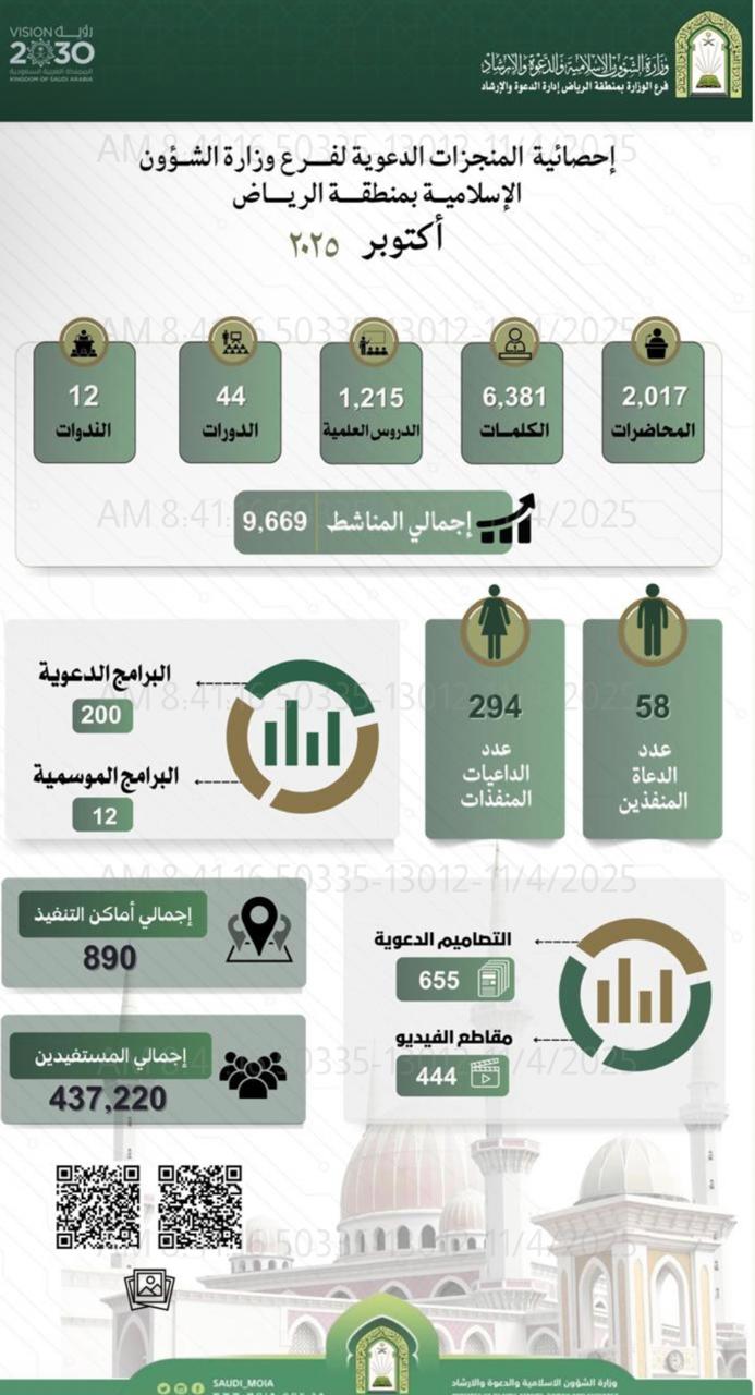 فرع الشؤون الإسلامية بالرياض ينفذ ٩٦٦٩ منشطاً دعوياً بمدينة الرياض خلال شهر أكتوبر ٢٠٢٥نفذ فرع وزارة الشؤون الإسلامية والدعوة والإرشاد بمنطقة الرياض، ممثلاً بإدارة الدعوة والإرشاد، خلال شهر أكتوبر ٢٠٢٥م، (٩٦٦٩) منشطًا دعويًا متنوعًا، استفاد منها أكثر من (٤٣٧,٢٢٠) مستفيدًا ومستفيدة في مختلف 13/جمادى الأولى/1447 التفاصيل