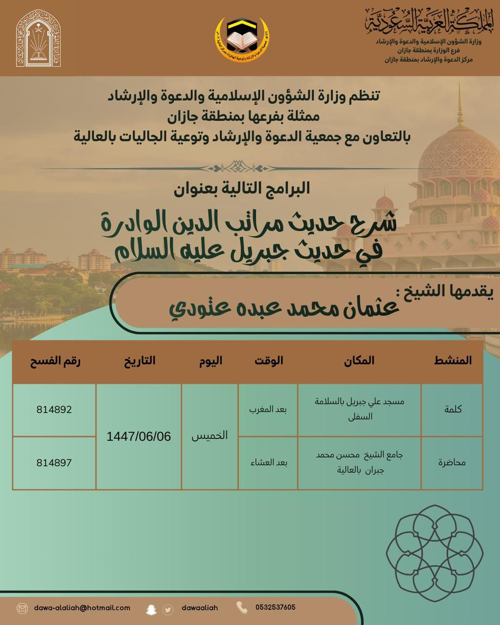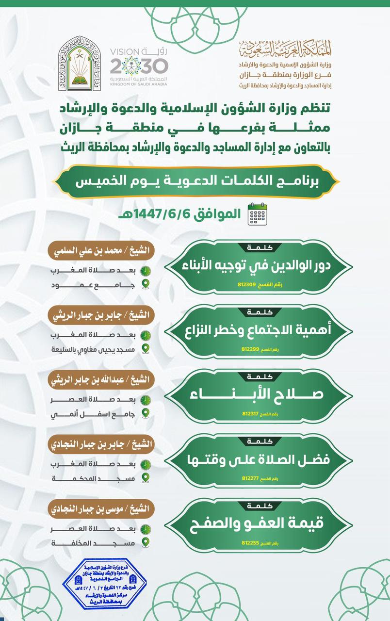 سلسلة كلمات ومحاضرتين دعويتين تُقيمها الشؤون الإسلامية بجازان في محافظتي العارضة والريثيُقيم فرع وزارة الشؤون الإسلامية والدعوة والإرشاد بمنطقة جازان، ممثلاً بإدارة المساجد والدعوة والإرشاد بمحافظة الريث، وبالتعاون مع جمعية الدعوة والإرشاد وتوعية الجاليات بمركز القصبة التابع لمحافظة العارضة، 04/جمادى الثانية/1447 التفاصيل