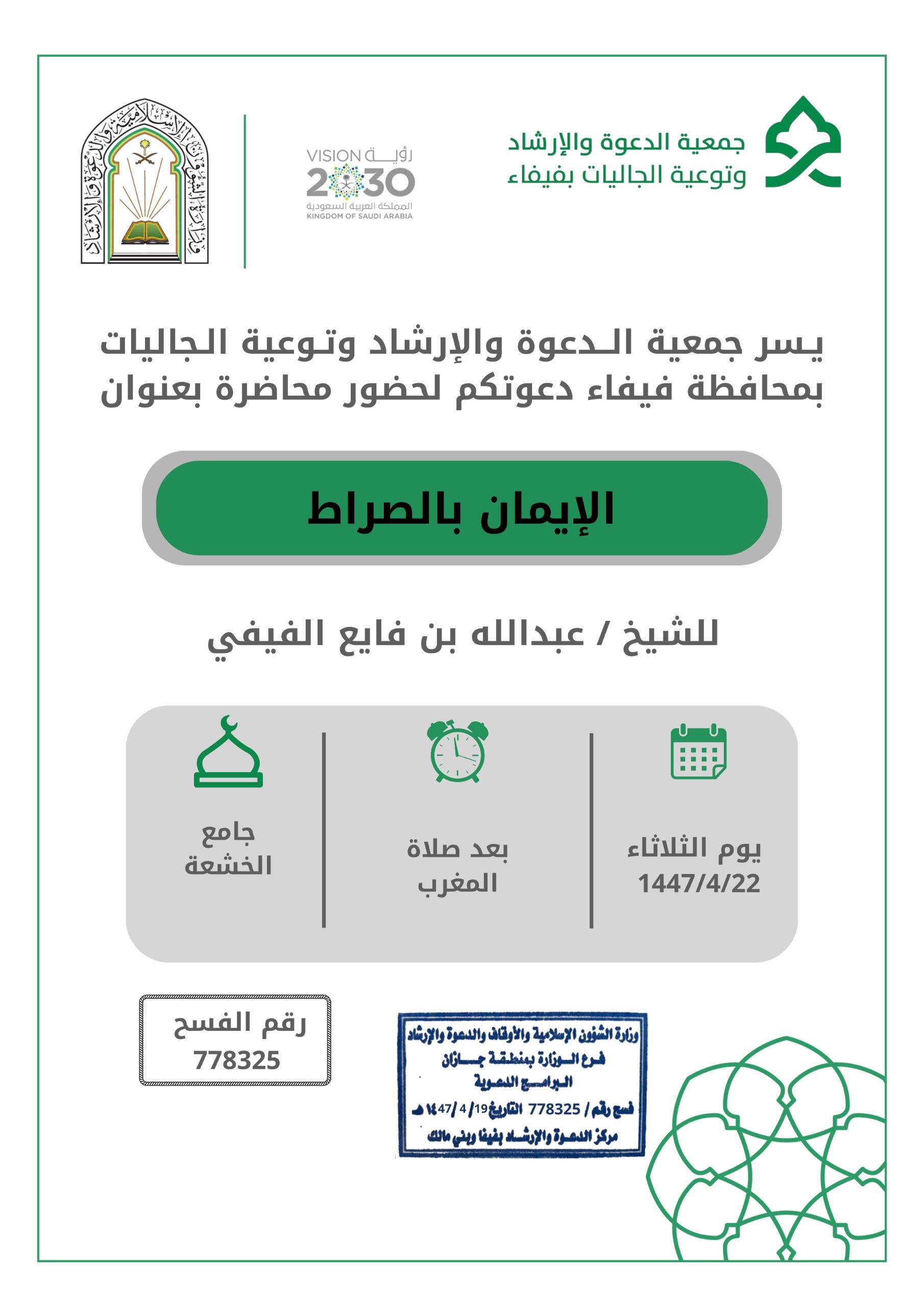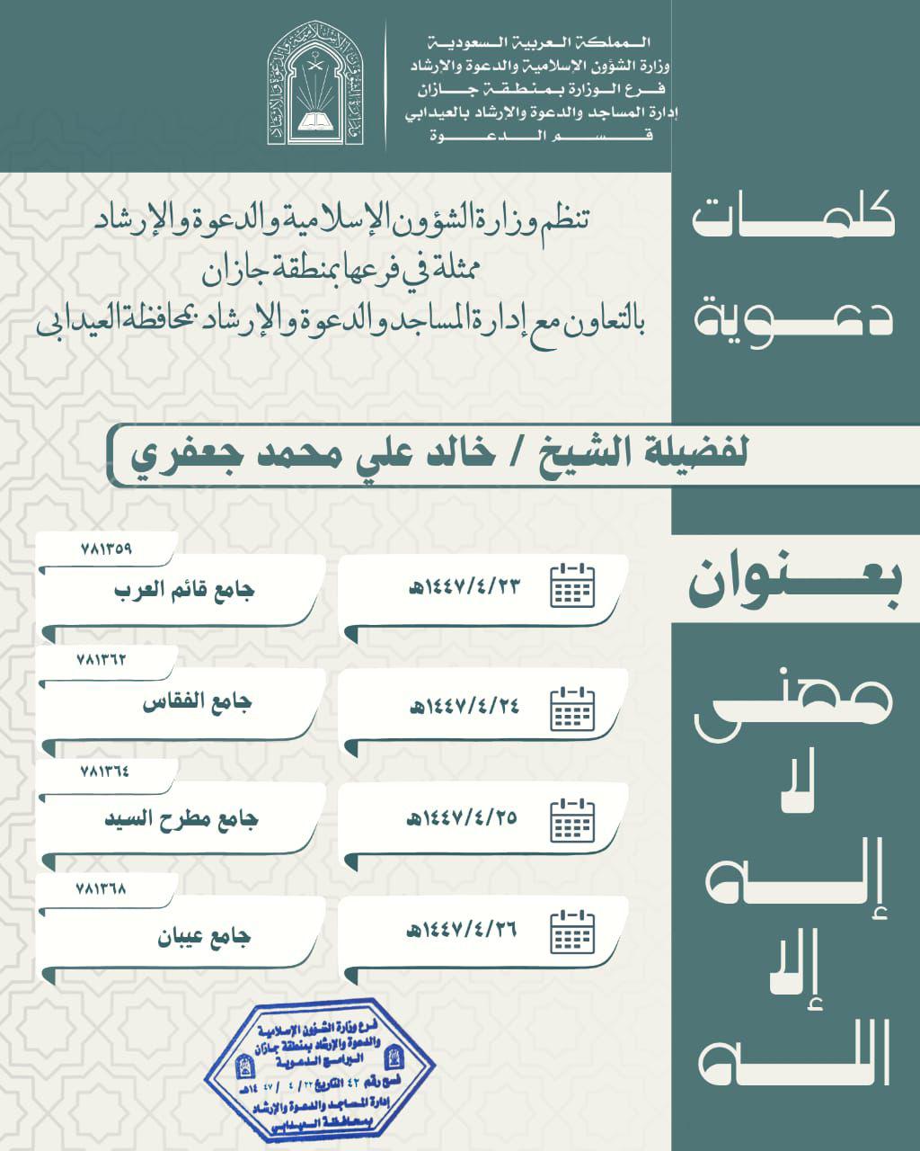 كلمات دعوية ينفذه فرع وزارة الشؤون الإسلامية في جازان بمساجد وجوامع محافظة العيدابي ينظم فرع وزارة الشؤون الإسلامية والدعوة والإرشاد في منطقة جازان ممثلاً بقسم الدعوة التابع لإدارة مساجد محافظة العيدابي سلسلة من الكلمات الدعوية والتي تنطلق مساء اليوم الأربعاء الثالث والعشرون من شهر 23/ربيع الثاني/1447 التفاصيل