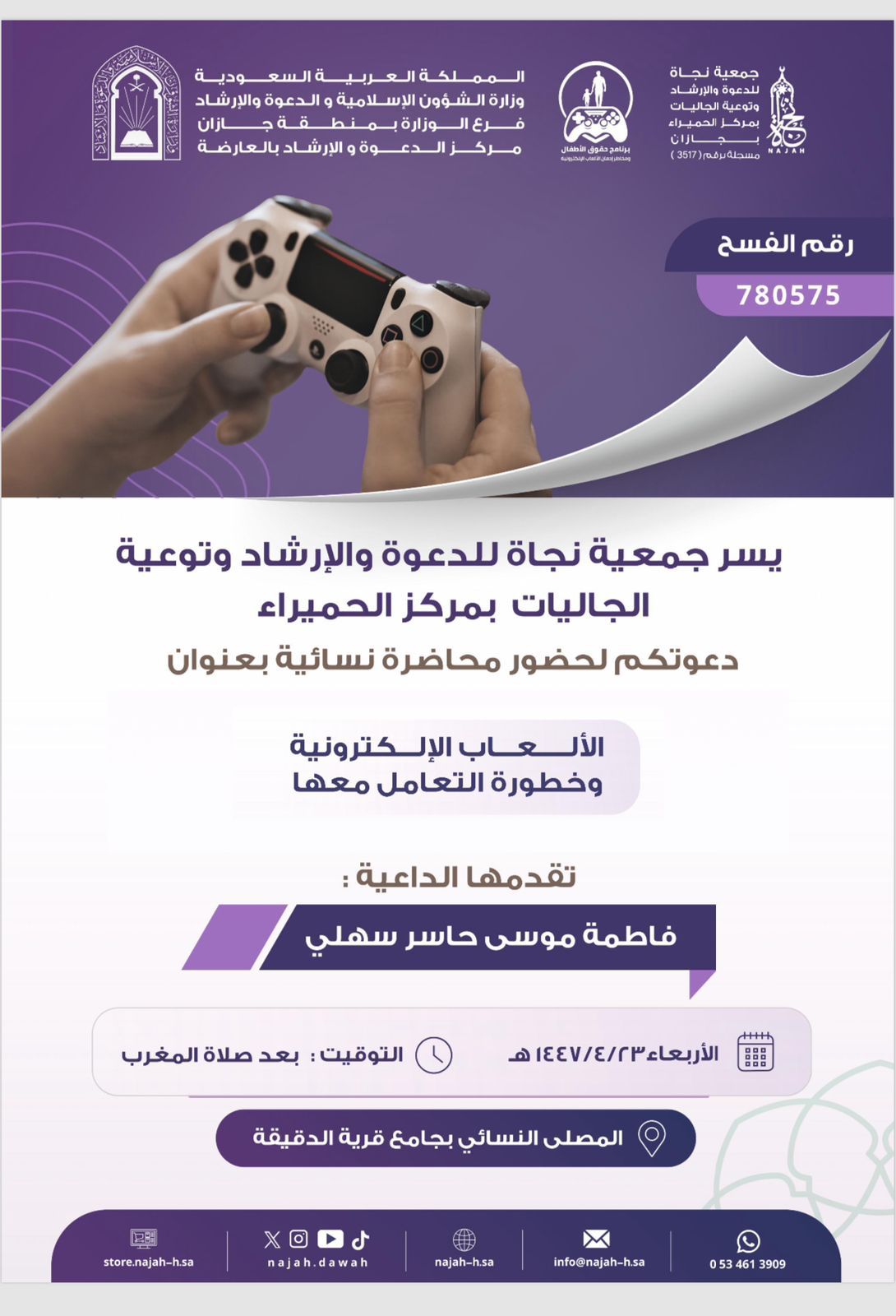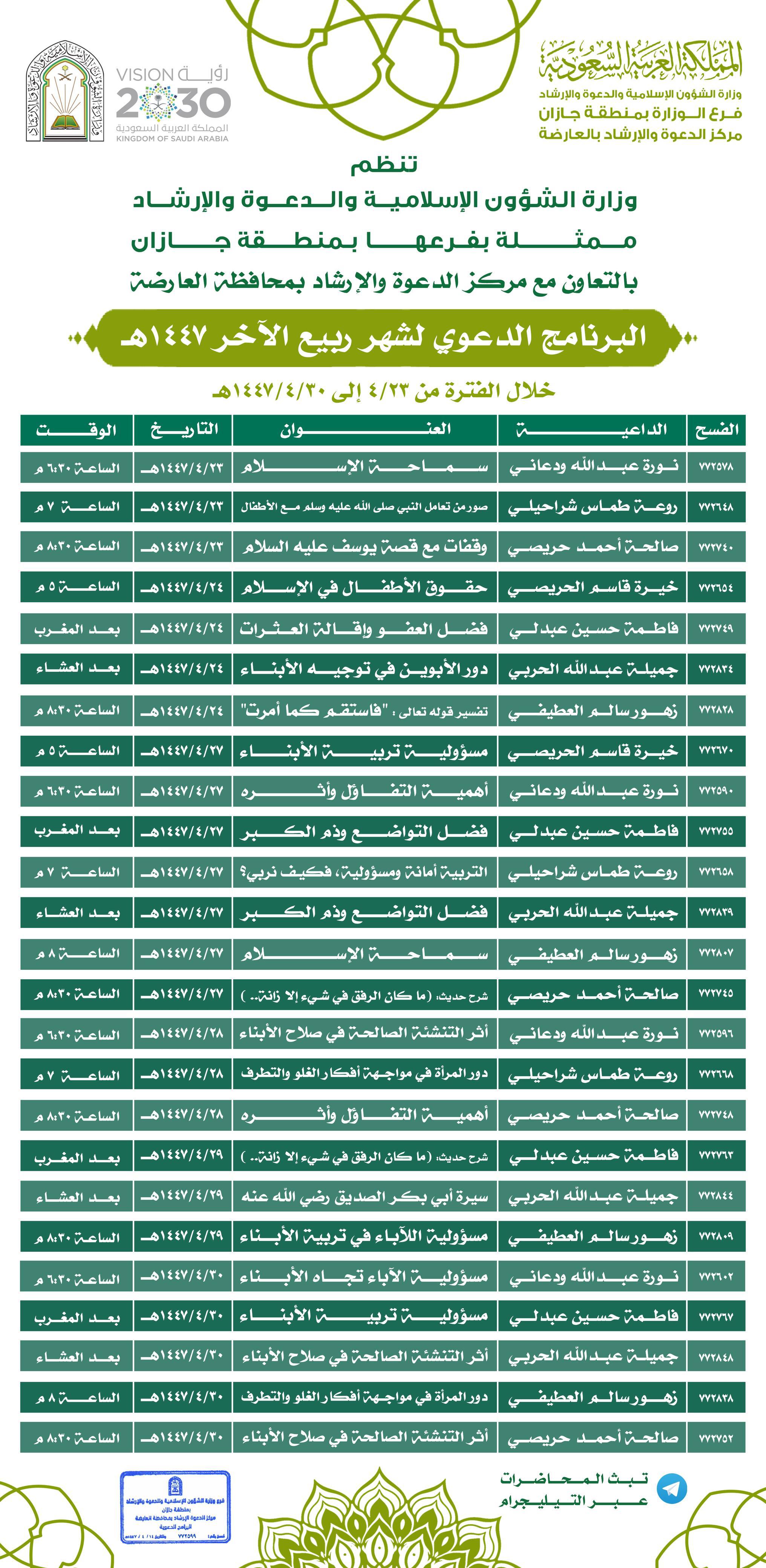 الشؤون الإسلامية في جازان تطلق المرحلة الثانية من البرنامج الدعوي لشهر ربيع الثاني من العام الحالي يواصل فرع وزارة الشؤون الإسلامية والدعوة والإرشاد في منطقة جازان ممثلاً بمركز دعوة محافظة العارضة تنفيذ برنامجه الدعوي النسائي لشهر ربيع الثاني من العام الحالي 1447 هجرية حيث تنطلق اليوم الاربعاء الثالث 23/ربيع الثاني/1447 التفاصيل
