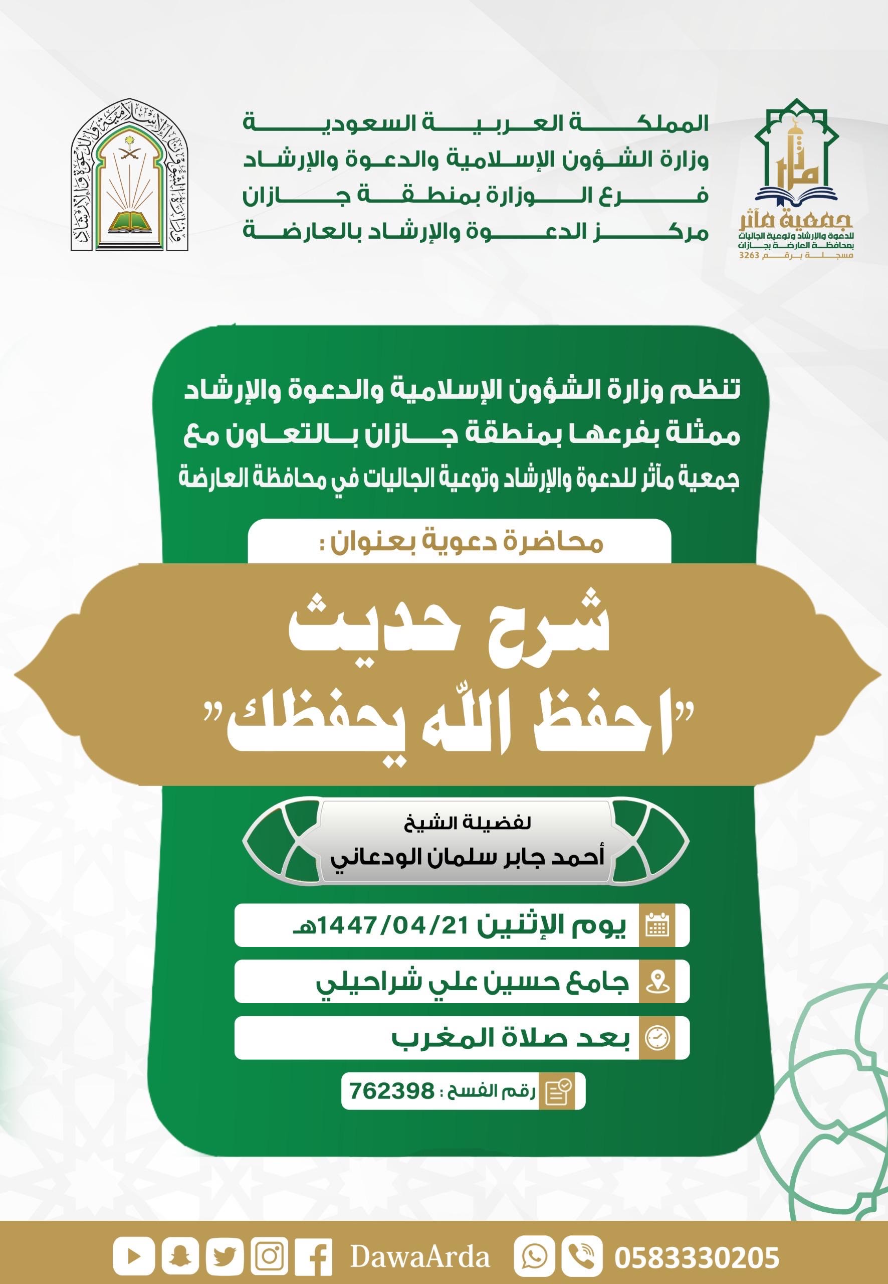 سلسلة من الكلمات الدعوية ينفذها فرع وزارة الشؤون الإسلامية بجازان في جوامع ومساجد مدينة جيزان ينظم فرع وزارة الشؤون الإسلامية والدعوة والإرشاد في منطقة جازان ممثلا بمركز الدعوة بمدينة جيزان مساء اليوم الثلاثاء الثاني والعشرون من شهر ربيع الثاني 1447 هجرية سلسلة من الكلمات الدعوية بمشاركة قسم 22/ربيع الثاني/1447 التفاصيل