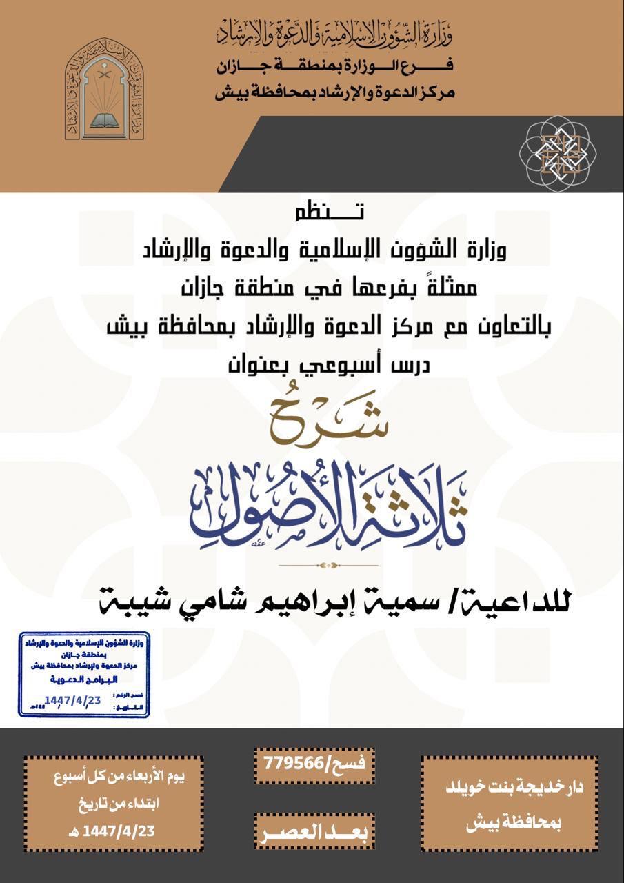 الشؤون الإسلامية بجازان تنفذ برنامج نسائي "التأصيل العلمي لحفظ المتون” في أبو عريش نفذ فرع وزارة الشؤون الإسلامية والدعوة والإرشاد في منطقة جازان، ممثلاً بقسم الدعوة في إدارة مساجد محافظة أبو عريش، برنامجاً دعوياً نسائياً أسبوعياً بعنوان “التأصيل العلمي لحفظ المتون”، وذلك يوم الأربعاء 20/ربيع الثاني/1447 التفاصيل