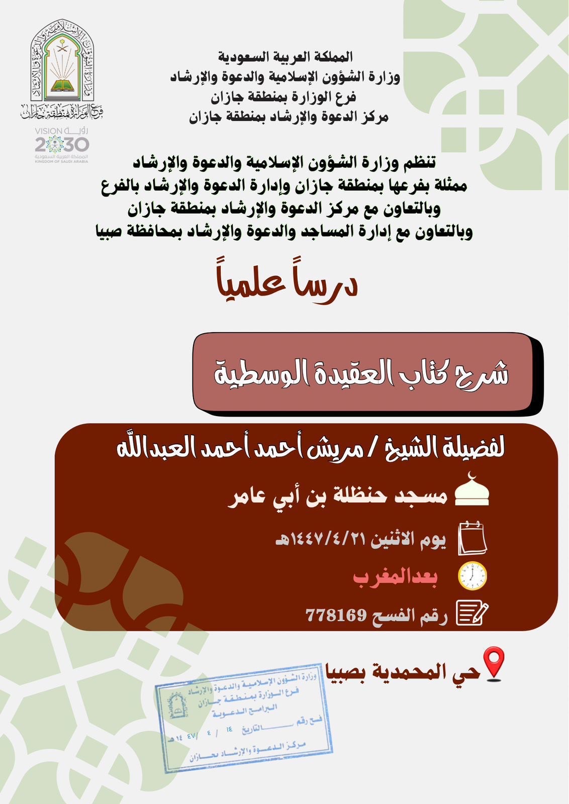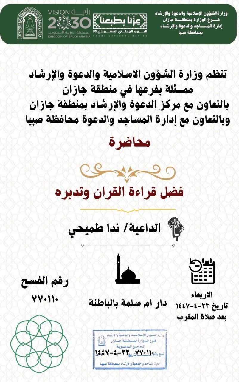 دروس علمية وكلمات دعوية تنفذها الشؤون الإسلامية بجازان في عدد من محافظات المنطقة نفذ فرع وزارة الشؤون الإسلامية والدعوة والإرشاد في منطقة جازان عددًا من الدروس العلمية والكلمات الدعوية ضمن البرنامج الدعوي الشهري الذي يُقام في مختلف محافظات المنطقة. ففي محافظة ضمد، أُقيمت مساء 20/ربيع الثاني/1447 التفاصيل
