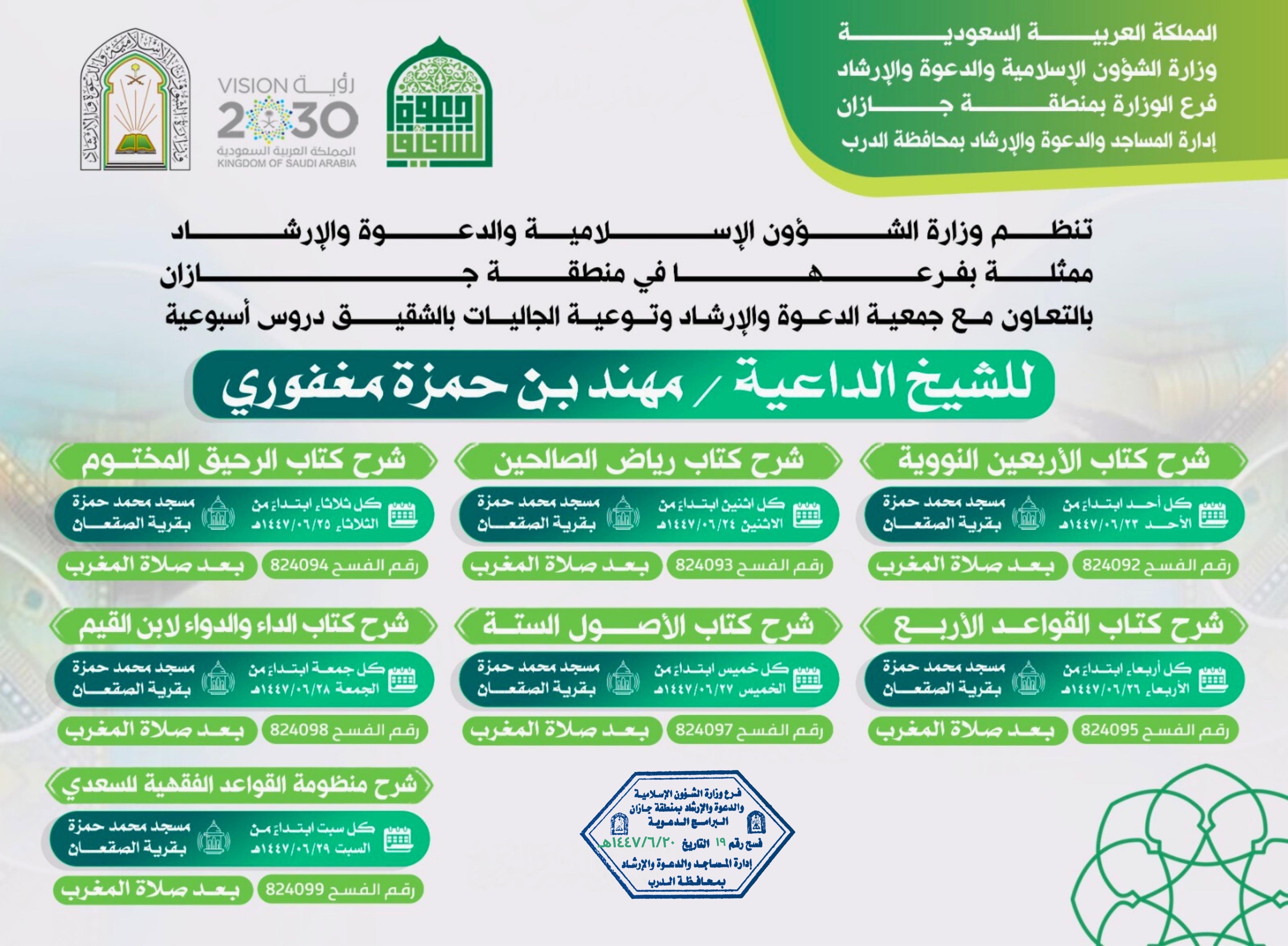 الشؤون الإسلامية بجازان تنفّذ سلسلة من المناشط الدعوية بعددٍ من محافظاتها تنفّذ وزارةُ الشؤون الإسلامية والدعوة والإرشاد، ممثّلةً بفرعها في منطقة جازان، سلسلةً من المناشط الدعوية المتنوعة، وذلك ضمن التقويم الدعوي الشهري لشهر جمادى الآخرة لعام 1447هـ. ففي محافظة أحد المسارحة، 24/جمادى الثانية/1447 التفاصيل