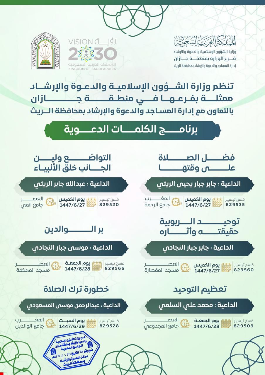 الشؤون الإسلامية بجازان تطلق برامج دعوية متنوعة بمحافظة الريث تنفّذ وزارةُ الشؤون الإسلامية والدعوة والإرشاد، ممثّلةً بفرعها في منطقة جازان، وبالتعاون مع إدارة المساجد والدعوة والإرشاد بمحافظة الريث، برامجَ دعويةً متنوعة، وذلك ابتداءً من مساء يوم الخميس السابع 25/جمادى الثانية/1447 التفاصيل